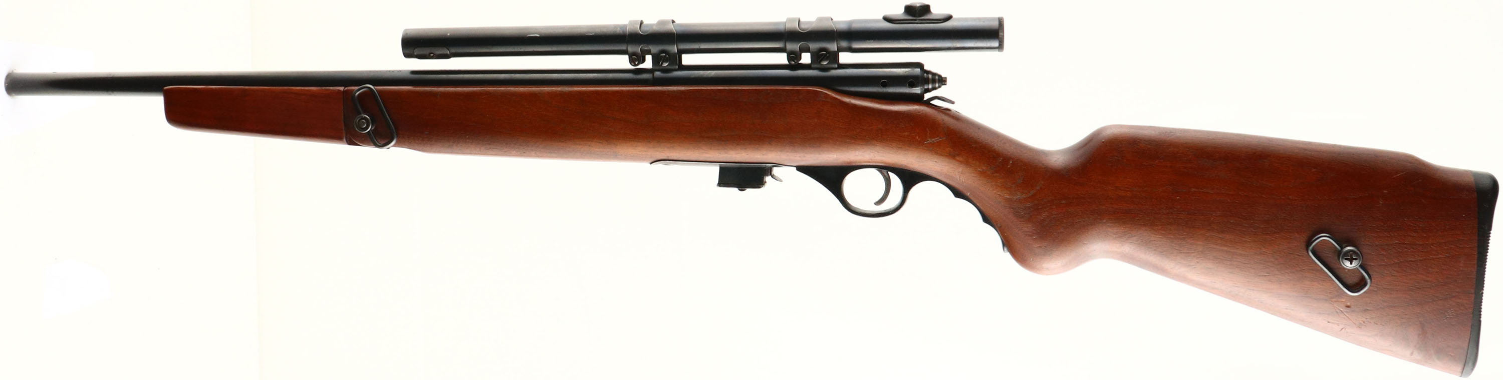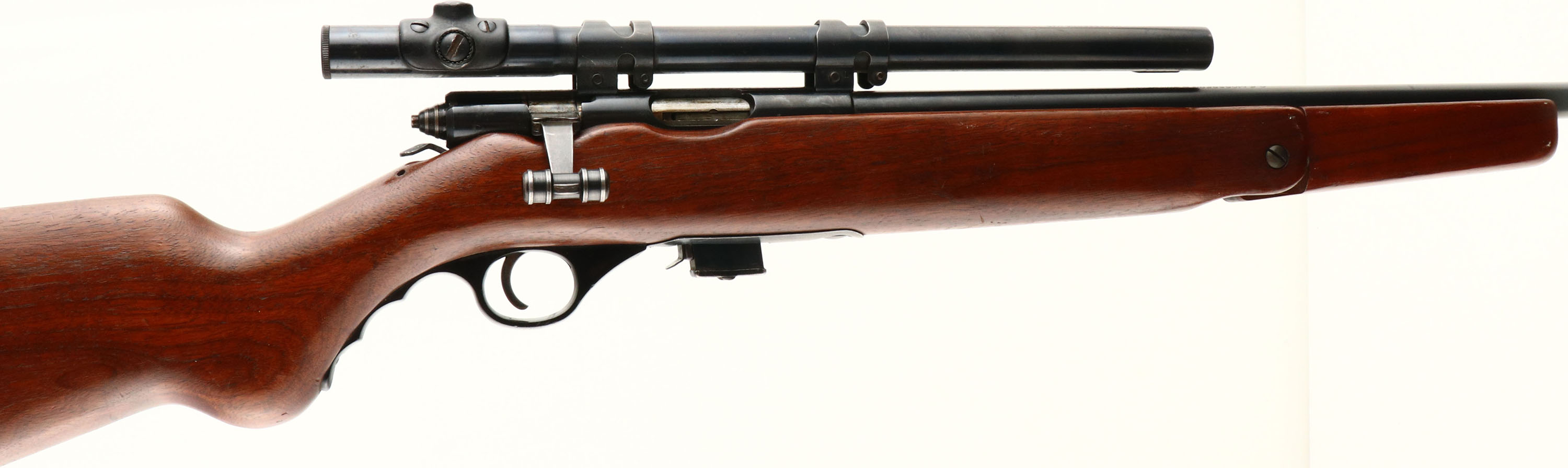 Mossberg, Model 142-A, CAL: 22 S,LR, MFG: 1949-57, SN: NONE, Bolt Action Carbine Length Rifle, 18 1/4'' barrel. The original round knob Monte Carlo stock style is excellent, This model has a unique fold-down foregrip, with this particular rifle having the very early wood version, as the later versions switched to plastic. The stock displays scrapes & contusions to the original finish. The metal blue finish rates 85% overall, with some additional wear on the floorplate. Bore is excellent. The receiver holds the original Mossberg No. M4d 4 Power scope, while the back left side of the receiver has two open holes from previous mounting of the receiver sight. The barrel has no open sights as the front sight has been removed. Stock carries a grooved plastic buttplate. Sling loops mounted on the left side of stock. Detachable 7 rd mag. FFL or C&R Req. - Value: 200 to 400