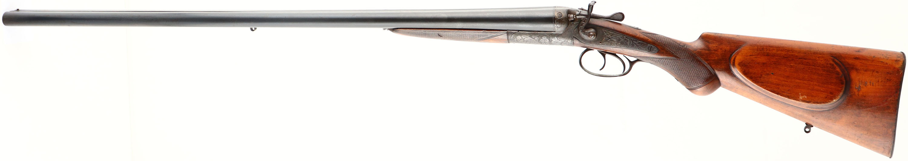 Belgium, SxS Shotgun, CAL: 12GA, MFG: N/A, SN: 13842, Break Action SxS, 29 5/8'' barrels. The original checkered & cheeked round knob wood stocks are excellent, having been lightly sanded & refinished at one time. There are smoothed contusions, dings & scrapes, with some areas of darkening from added finish. The metal blue finish on the barrels is a mix of original blue & brown patina, with consistent spotting throughout. The case-hardened receiver has fully toned to a smooth brown patina. Bores are excellent, with visible light wear from use. The solid matted rib holds a single front bead. Grooved metal buttplate. Double triggers. Sling stud in belly of stock & bottom barrel rib. Hammers both cock & triggers function. FFL & C&R Req. - Value: 200 to 400