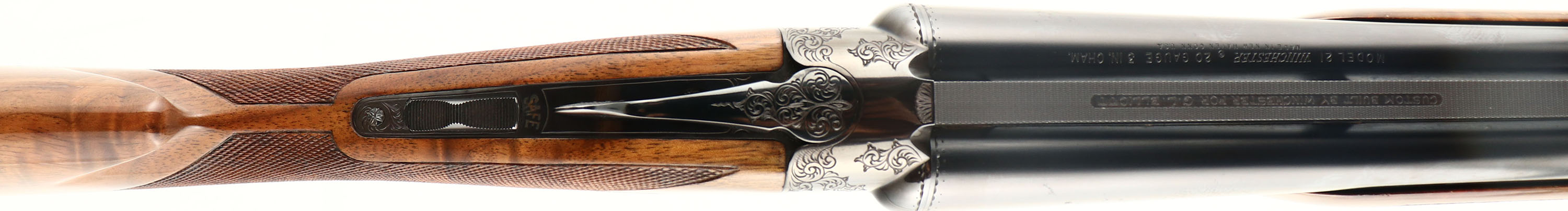 RARE Winchester Model 21- 1 Custom Grade, Two Barrel Set. CAL: 20 GA, MFG: 1931-90, SN: W33139, Break Action SxS Shotgun, Barrel Set 1: 28'' Winchester Proof Steel, with raised matted ventilated rib, white mid bead & red front bead, Top of rib engraved ''CUSTOM BUILT BY WINCHESTER FOR G.L. ELLIOT''. Left tube stamped ''WINCHESTER 20 GAUGE 3 IN CHAM''. Bottom of tubes with choke markings ''FULL/FULL''. Jeweled barrel flats, with SN & Winchester proof marks. Barrel set 2: Made exactly the same as set 1, but 26'' barrels & choke markings ''CYL/MOD''. Both barrel sets carry their own original, fine hand checkered in point pattern, beavertail forends, with rounded triangular ebony tips. Matching SN stamped on forend steel & wood. The deluxe grade, fancy walnut stock displays fantastic rippled & feathered grain. The straight grip features a fine hand checkering & gold oval on belly with the initials ''GLE'' engraved onto it. The stock carries a checkered Winchester plastic buttplate. The stock has water damage, which has caused the finish on the lower half of the stock to crinkle & flake away. There is some black staining in the area as well & a couple of small edge chips in the darkened areas on each side of the comb. The receiver features 21-1 pattern hand engraving of scrolls & border detailing. This pattern provides about 25% coverage. Then engraving extends onto the trigger guard & steel portions of the forend. The metal blue finish on the receiver is toning a beautiful plum, rating 99%, with some light speckling on the belly of the receiver. The barrels appear to carry the original blued finishes, with 98% coverage & loss due to spotty areas of corrosion. The 26'' bores are excellent, while the 28'' bores are very good, with use striations. The shotgun weighs 6lbs 9 1/2 oz with the 26'' barrels. LOP is 13 7/8'', DAC 1 1/2'', DAH 2 1/2''. With approximately only 40,000 Model 21 shotguns produced in all grade & all model 21's being custom ordered, they are often considered the pinnacle of Winchester shotgun collecting. This example has great bones & can be used & enjoyed in its present condition, or taken to an expert professional restorer to recapture its full beauty. FFL Req. - Value: 5000 to 10000