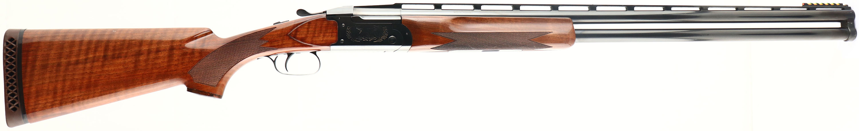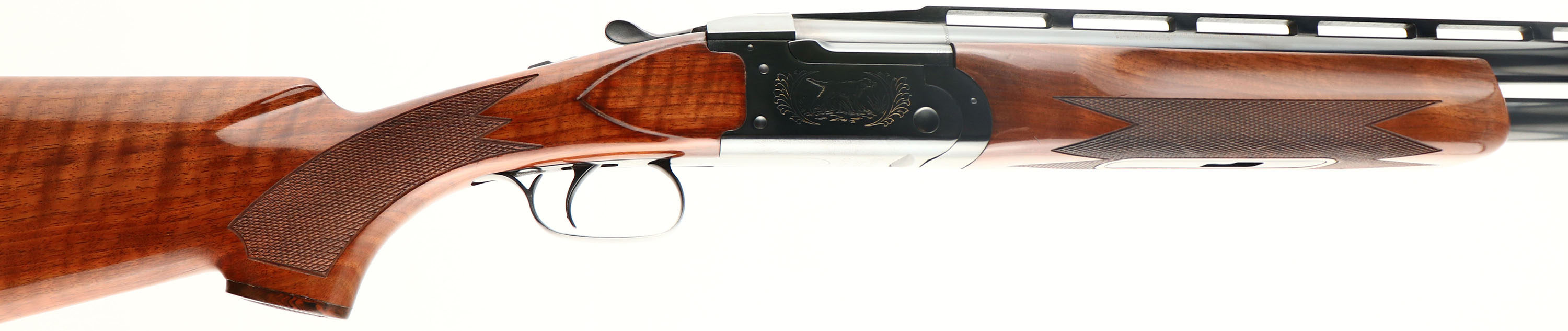 Remington Model 3200, CAL: 12 GA, MFG: 1973-84, SN: OU-24293, Break Action O/U Shotgun, Choke: FULL/IM, 2 3/4'', 30'' barrels with upper ventilated rib. First year production. Both sides of the receiver display a simple engraving of a pointer on the left & a setter on the right, bordered by a simple ornamental patterns. The engravings have a gold wash fill which is thinning or worn off in areas. The original checkered & capped pistol grip wood stocks are excellent, displaying very few tiny handling blemishes to the original high gloss finish. The original metal blue finish rates 98% overall. Bores are excellent & bright. The ventilated rib holds a small silver mid-rib bead & red/green fiber optic bar front sight. Single trigger with selector on upper tang. Buttstock carries a ventilated Remington recoil pad. LOP: 14 1/4'' overpad. An overall excellent & all original classic O/U. FFL Req - Value: 1000 to 1500
