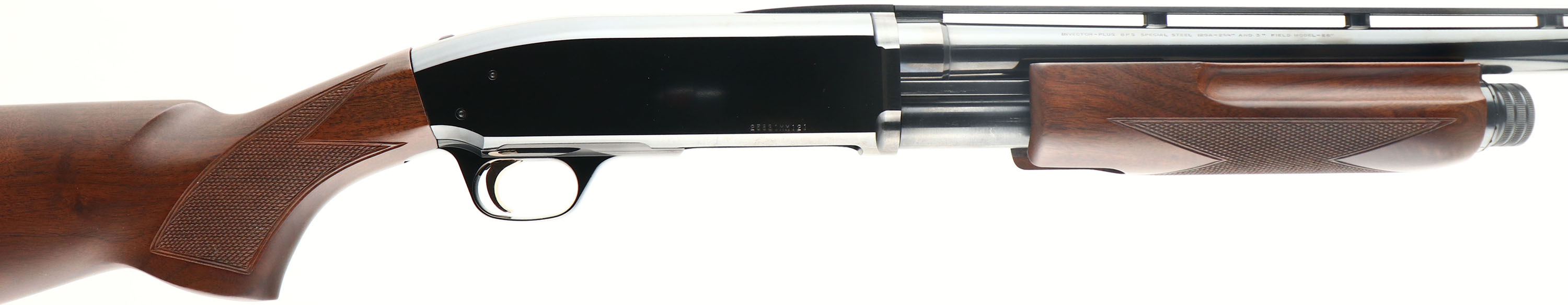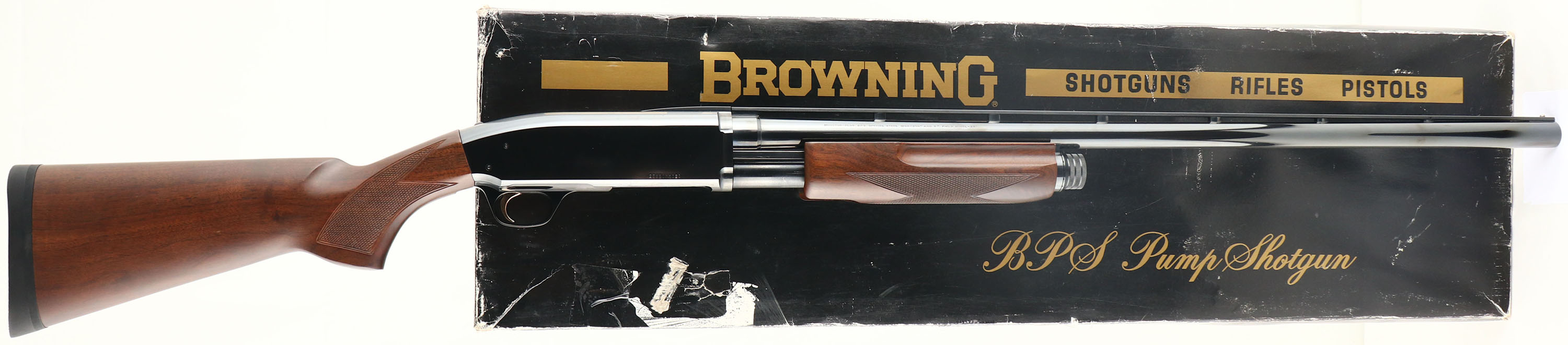 BOXED Browning, Model BPS Field Model, CAL: 12 GA, MFG: Modern, SN: 25831MM121, Pump Action Shotgun, 2/3/4'' & 3'', Choke: Invector-Plus, 28'' Ventilated ''Special Steel'' barrel. The original checkered & flat pistol grip wood stocks are near mint. They exhibit sharp checkering, with only a couple of very tiny storage blemishes. The original metal blue finish rates 99%+ overall. Bore is excellent. The barrel rib holds a silver front bead. Stock carries the original Browning solid rubber recoil pad, LOP: 14 1/4'' over pad. Silver trigger. Three total choke tubes. Comes in an original BPS box, but with different SN, factory paperwork & extra chokes. Box has edge wear & tape. FFL Req. - Value: 600 to 800