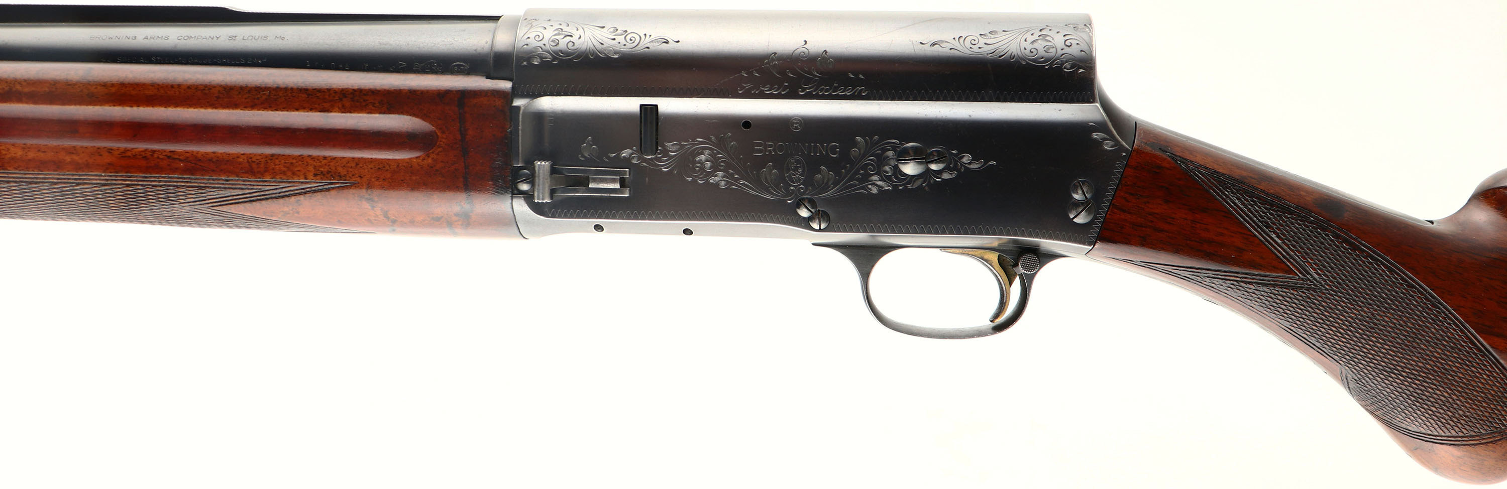 Browning, Model A5, SWEET SIXTEEN, CAL: 16 GA, MFG: 1956 (Belgium), SN: S71951, Semi-Auto Shotgun, Chamber: 2 3/4'', 27 1/2'' Matted solid rib barrel. The checkered & round knob pistol grip stocks are very nicely, having the remains of the original finish & an added coat of glossy finish. There are minor scratches, contusions & scrapes under the finish. There is a small patch of fill on each side of the toe, likely needed for a small toe repair. The checkering is very good. The original metal blue finish on the barrel rates 85% on barrel, 80% on receiver, with the majority of loss found on the belly of the receiver & the lower tang. Typical decorative hand engraving on receiver. Bore is excellent. The rib holds a single front bead. The buttstock carries the original FN Browning buttplate, LOP: 14 1/8''. Much of the gold wash on trigger is fading. The sweet-sixteen presents very well. FFL or C&R Req. - Value: 600 to 1000