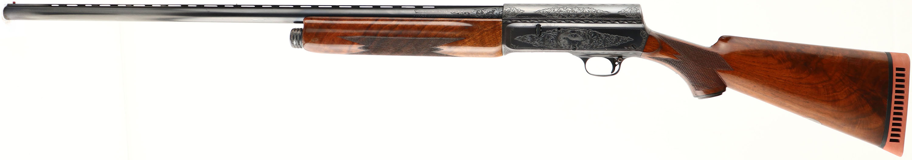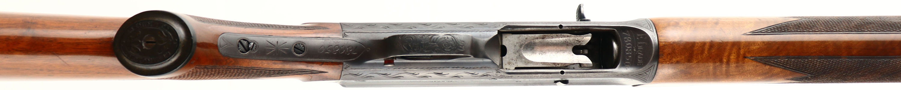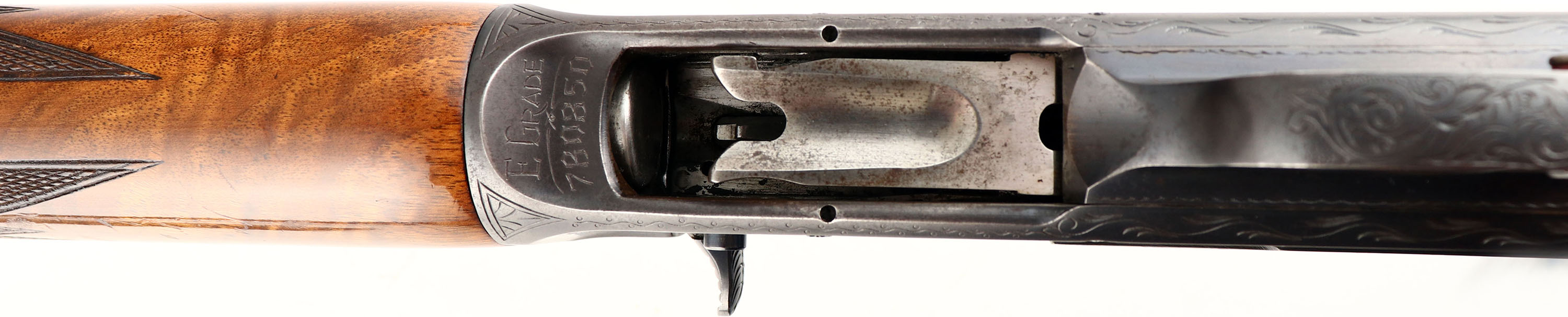 ENGRAVED Remington Model 11, ''E'' Grade, CAL: 12 GA, MFG: 1905-47, SN: 780850, Semi-Auto Shotgun, Choke: F, 30'' Ventilated matted rib barrel. Custom shop ''E'' grade or sometimes referred to as a No. 5 Expert Grade. The special order shotgun has high grade walnut wood stock & forearm, which are excellent, with very nice figure to the grain. Factory checkering is 22 lines-per-inch. The stocks carry the original factory finish, with minor handling scuffs, scratches & dings. The stock carries a cap on the pistol grip & an inlaid silver initial plate in the belly of the stock, typically found on Expert (''E'' grade) guns. The original metal blue finish rates 95% on the barrel, 90% on the receiver. The large receiver side panels are covered with what Remington marketed as ''rich scroll hand engraving & game scenes''. The left side of receiver is engraved with a large English Setter on the left & a Geman Shorthair on the right, both in hunting scenes. The base of trigger guard, tangs & first 5'' of barrel all display wonderful ornamental, scroll or floral engravings. The bore is excellent. The ventilated, matted rib holds a single front sight bead. Buttstock carries a ventilated HAWKINS red rubber recoil pad. LOP: 14 3/4'' overpad. A very nice example of an engraved custom shop shotgun. FFL or C&R Req. - Value: 2500 to 4000