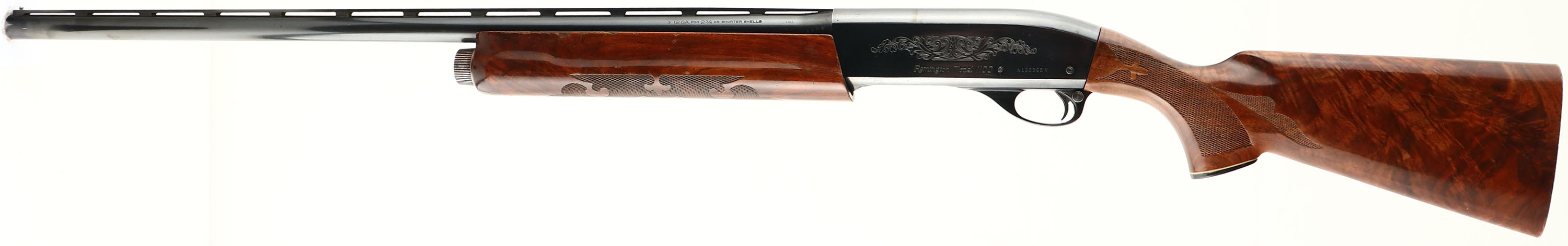 Remington, Model 1100, CAL: 12 GA, MFG: 1989, SN: N130965V, Semi Auto Shotgun, Choke: Full, 2 3/4'', 28'' Ventilated rib barrel. The original checkered & capped pistol grip wood stocks are very good, displaying numerous minor finish level scratches, scrapes & contusions to the original finish. The metal blue finish rates 90% on barrel, 85% on receiver, with a several small spots of loss on the top of the receiver & loading wear or scratches to the belly of the receiver. Bore is excellent & bright. The rib holds a single front bead. Buttstock is missing the recoil pad, LOP without pad is 13 3/8''. A high condition & light weight shotgun in a popular gauge for upland birds. FFL Req. - Value: 300 to 600