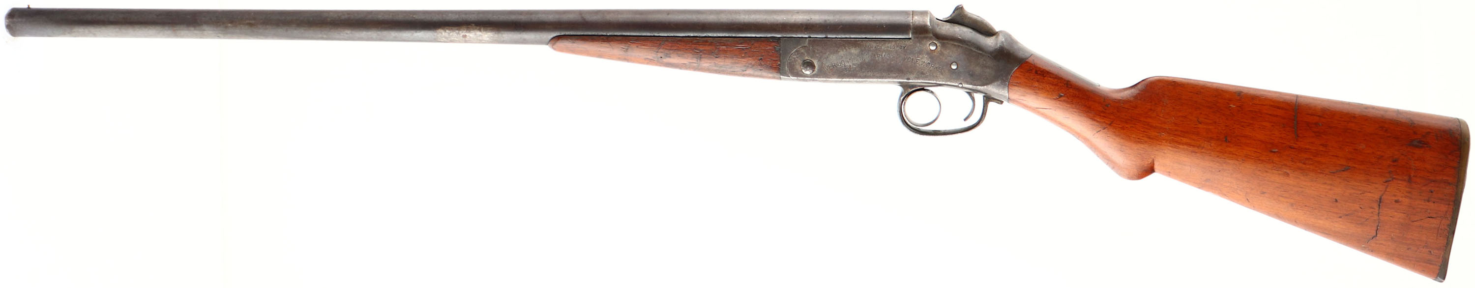 Iver Johnson Arms & Cycle Works, Model 1900 ''Ring Action'', CAL: 12 GA, MFG: 1905-08, SN: 49398, Break Action Single Shot Shotgun, 26 1/8'' barrel. The Iver Johnson Ring Action was the Model of 1900. Patent Number 697,516 was issued April 15, 1902 to O. F. Mossberg for a firearm lock, & assigned to Iver Johnson Arms & Cycle Works. Old advertisements show the asking price was $7.25. The round knob pistol grip wood stock & forend are very good & solid. There are numerous contusions, scrapes & scratches to the wood, which carries an added high gloss finish. The metal blue finish on the barrel rates 20%, with the majority toned to gray/brown patina, & with small areas of rust pitting grey. The case-hardened receiver has worn to metal grey, with brown patina & some remnants of case-colors in protected areas. Bore is very good, with bright & clean. The barrel holds a single front brass bead. Stock carries a I.J plastic buttplate. FFL or C&R Req. - Value: 150 to 300