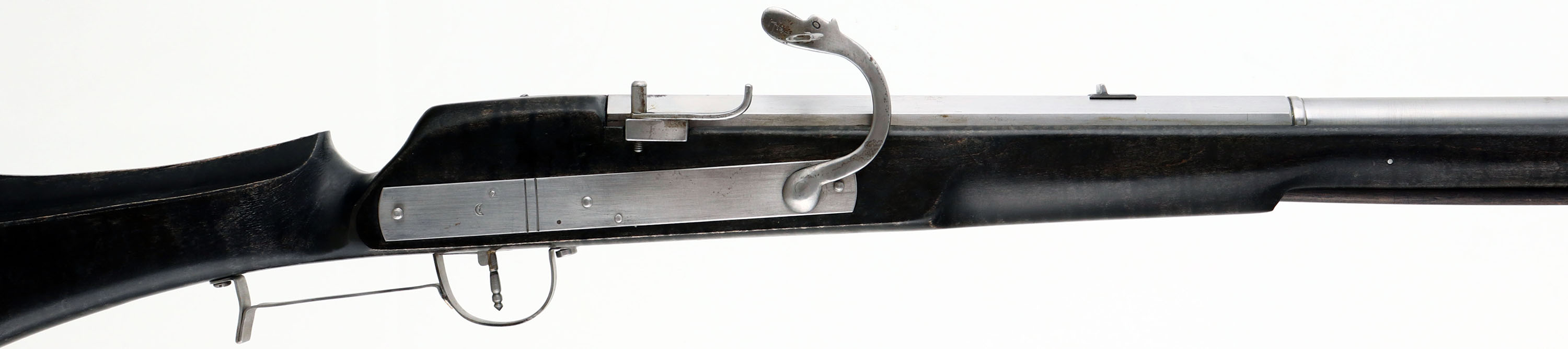 Augie Burgoon, Model 1606 Matchlock Rifle, CAL: 60 Smoothbore, MFG: 2008, SN: XIV, 36 7/8'' barrels. The ebony wood stock with integral thumb rest is excellent. There is some light edge wear to the finish around sharp corners. The barrel & frame have been polished & left in-the-white. There are visible buff lines, with a light area of spotting near the action. Bore is excellent & bright. Mechanical function is excellent. The barrel has a small fixed rear sight & small blade front sight. Augie Burgoon is a metal works teacher in a small college and made this as a personal project. Suggested load for this rifle is .60cal ball, with patch & 70-100gr 2Fg powder. Top of barrel flat is marked ''MDCVII'' & there is a quarter moon & ''XIV'' on the left barrel flat. Black powder, No FFL Req. - Value: 500 to 1000
