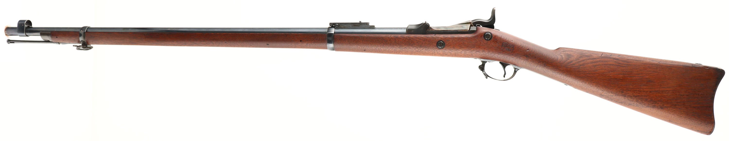 Springfield Armory, Model: 1884 Trapdoor (1873 marked breech), Cal: .45-70, MFG: 1887, S/N: 346806, single shot rifle, 32 '' barrel. The straight wrist walnut stock is excellent with only small minor nicks, dings, & scratches. Left side of wrist has a ''SWP'', ''1886'' in box cartouche. The belly of the stock is marked with the circle ''P'' proof cartouche. The blued metal finish on the barrel rates 90% with concentrated wear at the muzzle. The case-hardened finish on the breech block rates 90% with light wear & patina speckling. The top of the breech block is marked ''US'', ''MODEL'', ''1873''. Springfield would use up old 1873 marked breech blocks on the new 1884 Model. 1884 marked breech blocks would start coming out mid to late 1887. The rear of the receiver is marked with the S/N. the left side of the barrel is marked ''V'', ''P'', over eagles head, ''R'', ''P''. the top of the barrel is marked ''A''. the lock plate is marked with the American great eagle, ''U.S.'' ''SPRINGFIELD''. The bore is excellent. Its bright with very little wear. The barrel holds a blade front sight with protective hood, & a Buffington ladder rear sight. The stock carries a blued steel buttplate, has wear & small spots of patina. Rifle has both sling loops & the third stacking swivel. Rifle also has cleaning/clearing rod. A beautiful, high condition trapdoor Springfield. Antique, no FFL Req. - Value: 1000 to 2000