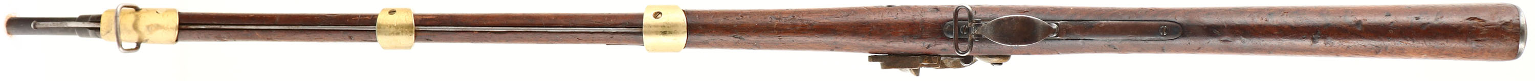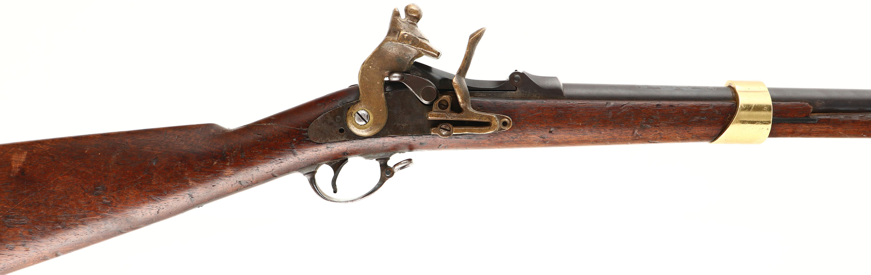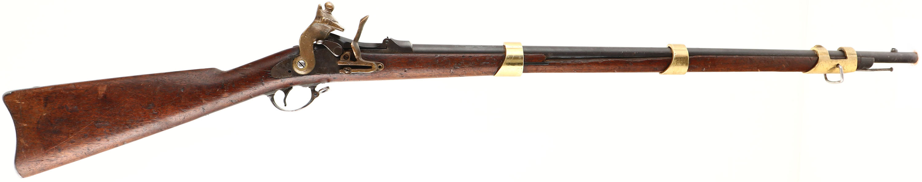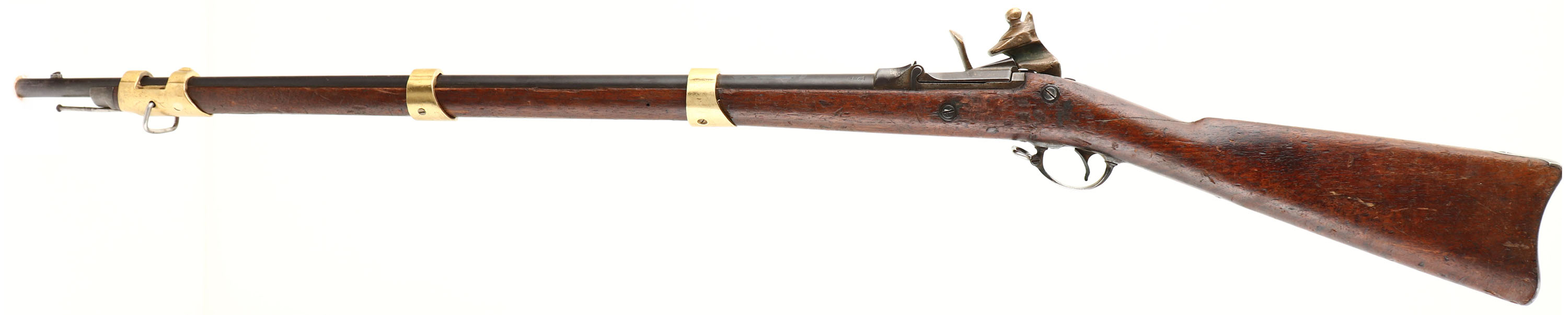 HISTORY: This is a surplus trapdoor rifle that was bought by a prop house & modified by them to look more like a flintlock rifle but still fire blank cartridges. They could be seen with different amounts of modifications, some were left in their full length, & some were chopped down into carbines. This rifle has beautiful brass furniture. These were prominent in the movies The Man from the Alamo (1953), & John Waynes The Alamo (1960). Included with this rifle are two still photos from those movies were these modified trapdoors can be seen.