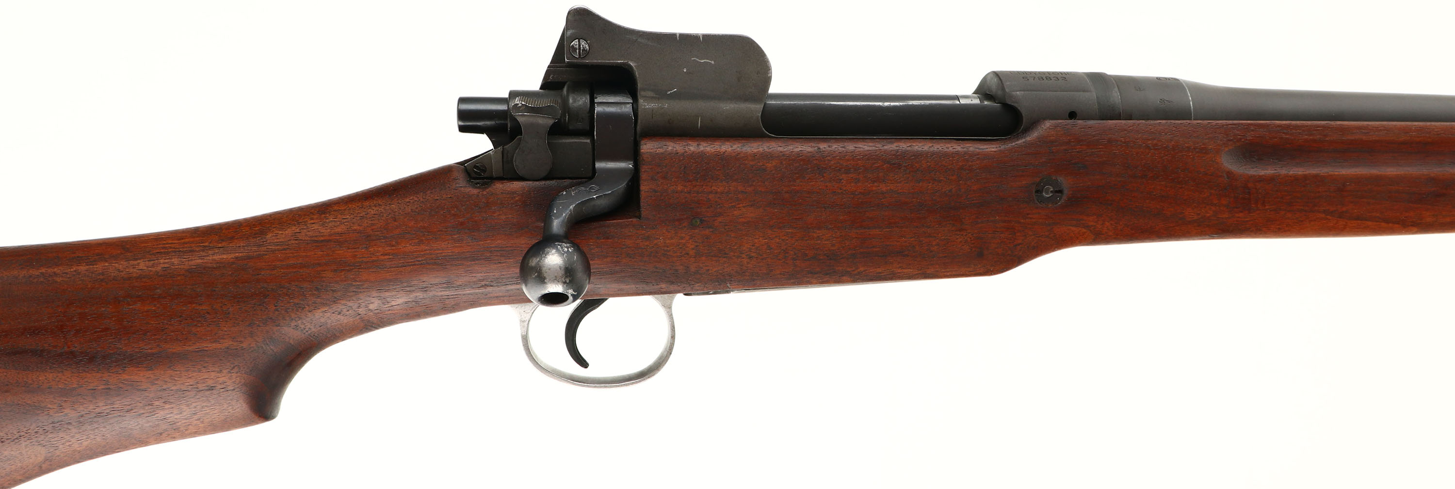 Eddystone, Model: M1917 Enfield, Cal: .30-06, MFG: May 1918 Receiver, Jan 1918 Barrel, S/N: 578832, Bolt action rifle, 26'' barrel. The semi-pistol grip walnut stock is very good as being cut down & upper hand guard missing. Stock has light nicks, dings, scratches & wear from use/age. The bottom of the wrist is marked with a faded ''P'' in square firing proof, & faint remains of a older stamp. The left side of the wrist is marked with ''S.A.A.'' in box, ''S'' in box, cartouches. The parkerized metal finish rates 80% overall with scratches & spots of thinning/wear. Left side of the receiver is marked with the US Flaming bomb acceptance stamp. The receiver band is marked ''U.S.'', ''MODEL OF 1917'', ''EDDYSTONE'', & the S/N. the rear of the barrel is marked with a flaming bomb stamp & three eagle proof stamps. The front of the barrel is marked ''E'', Flaming bomb, 1-18. has a Remington marked bolt handle with Eddystone components, the rest of marked parts are mostly Eddystone with a Winchester rear sight ladder. The bore is very good. Its bright with light roughness. Five groove rifling. The barrel holds a square blade front sight with protective ears. Receiver mounted flip up ladder, aperture rear sight, ladder marked 2 to 16. the stock carries a parkerized steel trapdoor buttplate. Nothing inside trapdoor. Rear sling swivel removed, still has base mount. FFL or C&R Req. - Value: 200 to 500