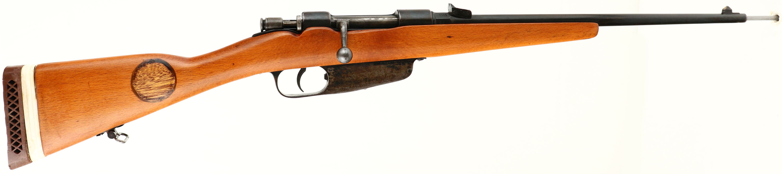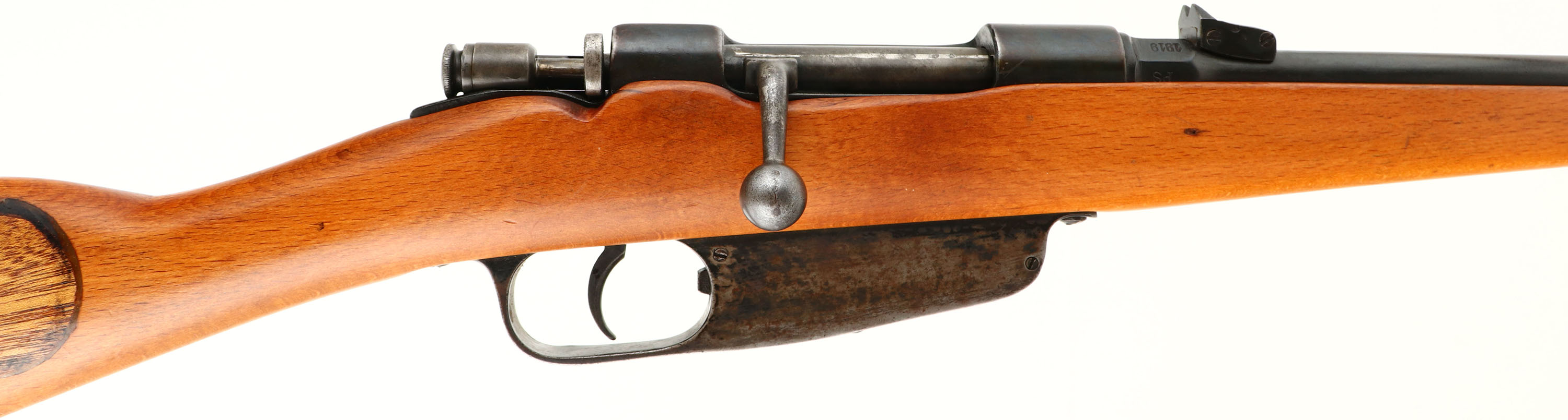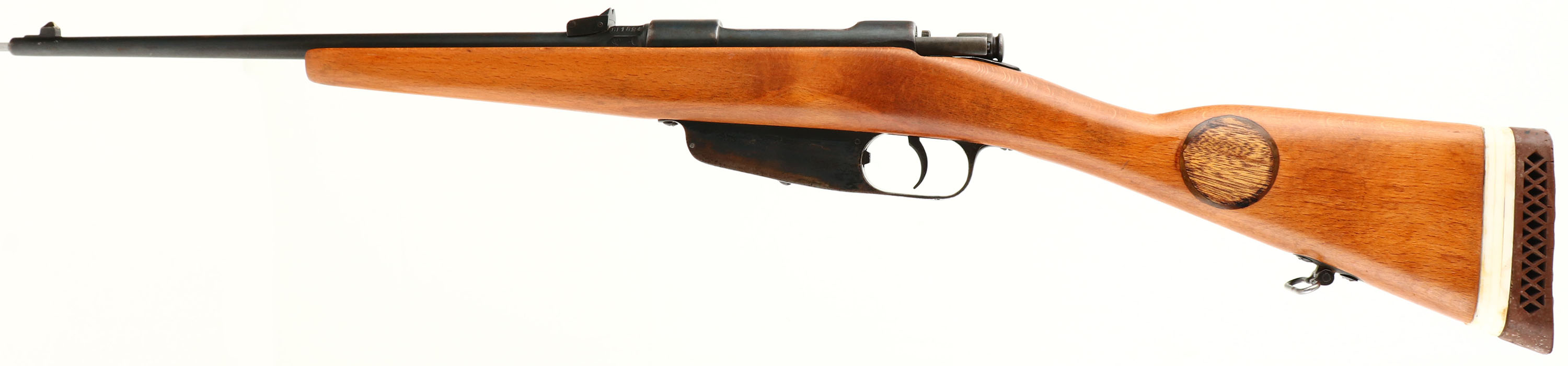 Brescia, Model M91 Carcano, Cal: 6.5x52mm Carcano, MFG: 1917, S/N: BJ1824, Bolt action rifle, 17 3/4'' barrel. The straight wrist wood stock is very good as being cut down & shaped. Has one wood decorative plugs on each cheek of the stock. The blued metal finish rates 80% on the receiver with spots of thinning & brown patina, & 85% on the barrel with spots of wear & brown patina. The top of the receiver band is marked with two proofs. The barrel is marked with ''BL'' in circle, worn crown proof, S/N, ''BRESEIA'', ''1919'', ''PS''. Mismatched bolt marked ''BH'', ''VG'' in circle, ''643C''. The bore is very good. Its bright with strong rifling, but has spots of roughness. The barrel holds a barleycorn front sight with a fixed, deep V-notch rear sight. The stock carries a rubber upland game recoil pad, with three plastic spacers. Rifle has rear sling swivel. FFL or C&R Req. - Value: 100 to 200