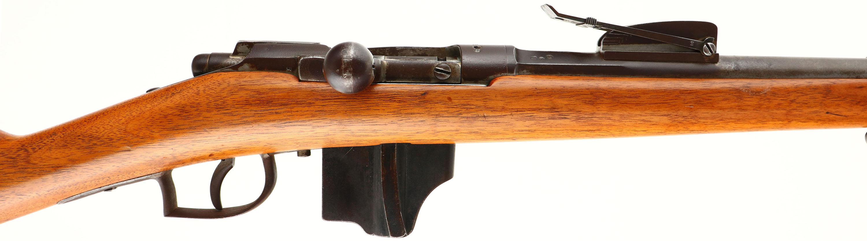 CONDITION: The straight wrist wood stock is excellent as being sanded & re-finished. Stock has a few minor nicks & dings. The metal has worn/toned to a mix of brown rust patina & gun metal gray. The top of the receiver band is marked with the S/N. the left side of the receiver has two small proofs. Left side of the barrel is marked ''792'', & has a SSN electro penciled into it. The top of the barrel is marked with a small proof, ''1873'', & more small proofs. The top tang of the buttplate is marked ''1890'', ''792''. All parts S/N matching other than the barrel. The bore is good. Its bright but has slightly thinned rifling, roughness, & spots of light pitting. The barrel holds a tall barleycorn front sight with a tangent V-notch rear sight marked 3 to 18 on the base. The stock carries a steel buttplate that's toned to a brown patina. Rifle has both sling loops & the cleaning/clearing rod. Antique, no FFL Req - Value: 200 to 500