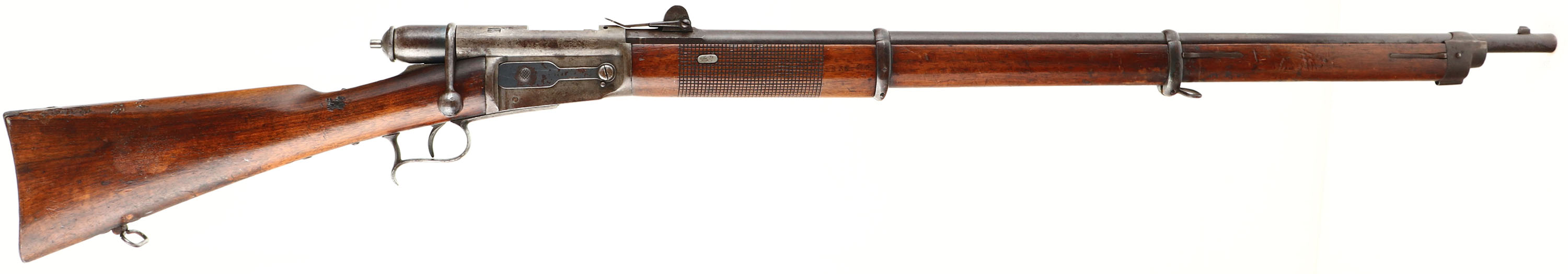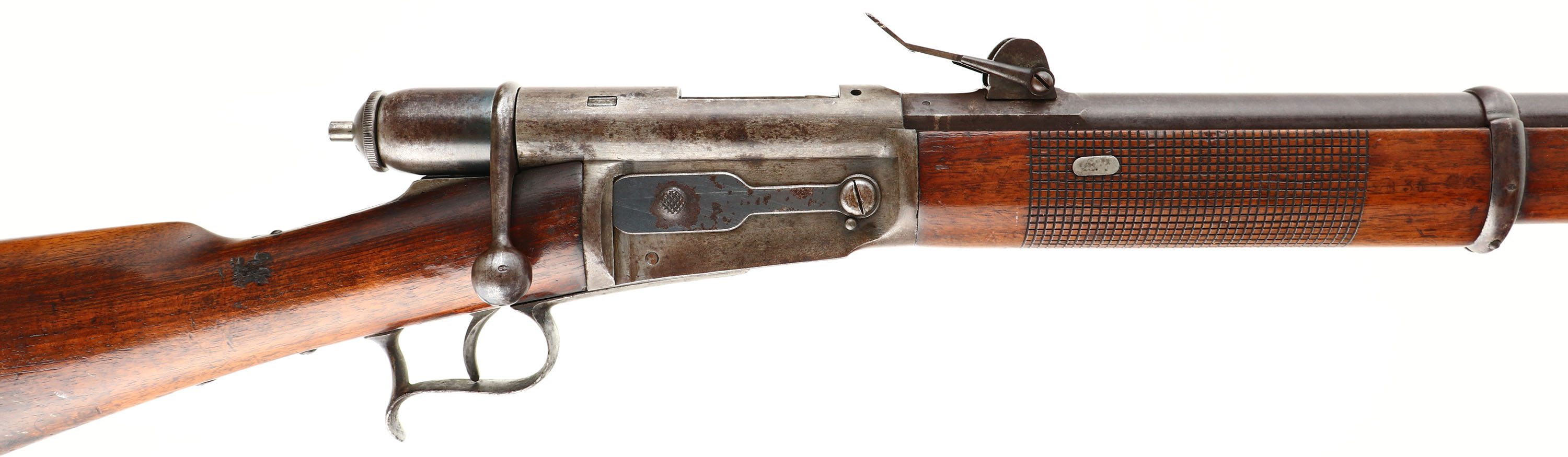 HISTORY: Originally designed In 1867, the Swiss Vetterli was highly advance for its time. Featuring a dual rear locking lug bolt, a tube magazine, & using a metallic intermediate cartridge. Most countries at this time had single shot metallic cartridge guns, some were still using paper cartridge guns or even muzzleloaders. The M1869 model was the first to go into full scale production, noticeably it featured a checkered handguard, a magazine cutoff, & a loading gate. Basel is the second rarest MFG of these rifles with only making only 7000 rifle from 1869 to 1873.
