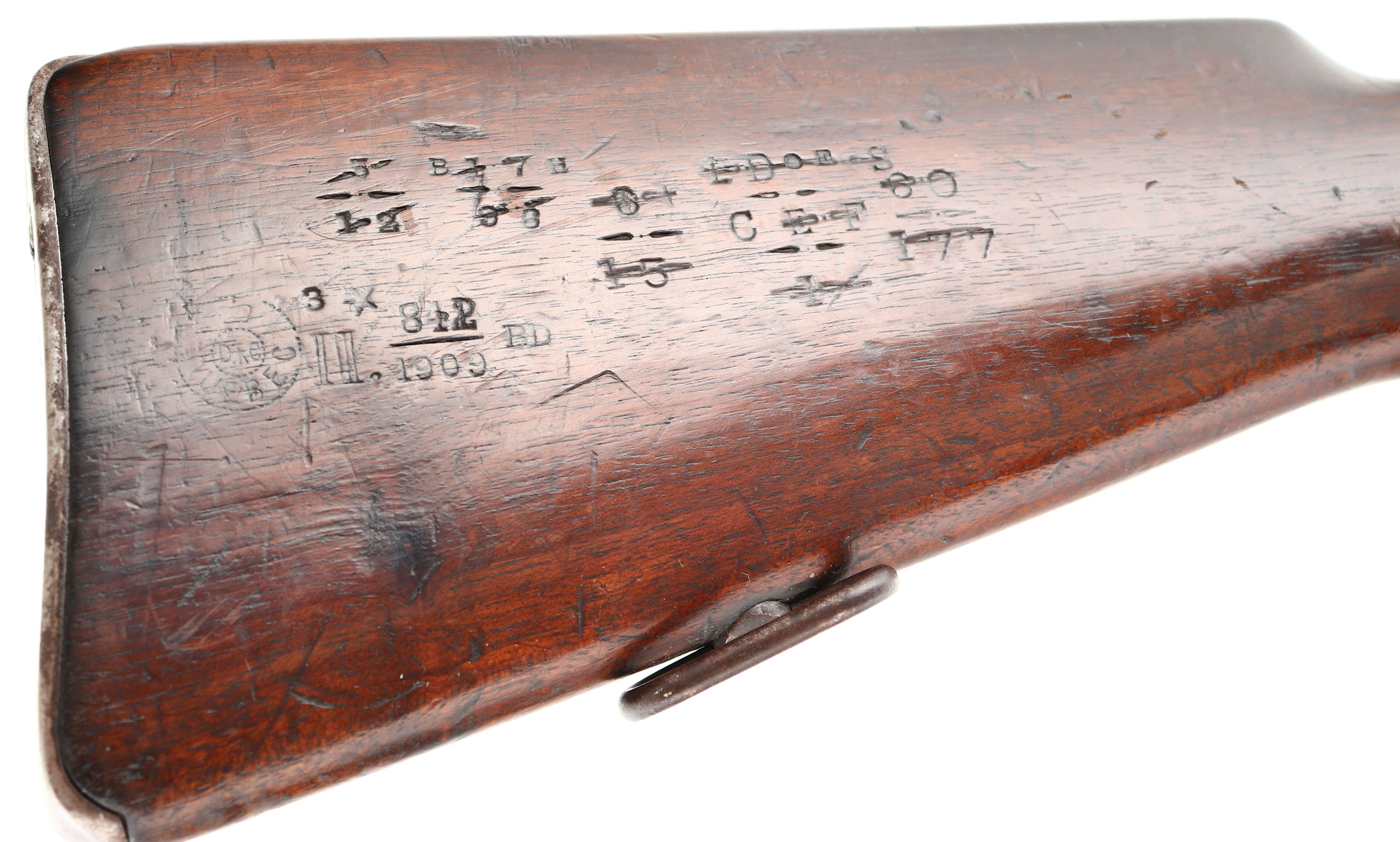 CONDITION: The semi-pistol grip wood walnut stock is very good with small nicks, dings, scuffs & scratches from use/wear. The bottom of the wrist is marked ''US'' & the S/N. the right cheek of stock is line out regiment & unit markings, as well as a Roundel cartouche marked with a crown at the top, ''D'' arrow ''C'' in the middle, & ''QUEBEC'' on the bottom. To the right of the Roundel is ''3*'' over ''II.'', ''842/1909'', ''RD''. The metal has mostly toned to a brown patina, with spots of gray, & thinned finish on the barrel. The left side of the receiver is marked ''ROSS RIFLE CO QUEBEC.CANADA.1905.'', ''PATENTED''. The bore is very good. Its bright with spots of light roughness. The barrel holds a hooded, square post front sight with a V-notch/aperture, flip up ladder rear sight. The stock carries a steel trapdoor buttplate. Has worn gray with spots of patina. Nothing inside trapdoor. Rifle has three sling swivels with a stacking loop. Comes with a Ross bayonet 1907 patent date, with sheath & frog. Bayonet grips have a bunch of crossed out numbers, with numerus other markings on the guard & pommel. FFL or C&R Req - Value: 1000 to 2000