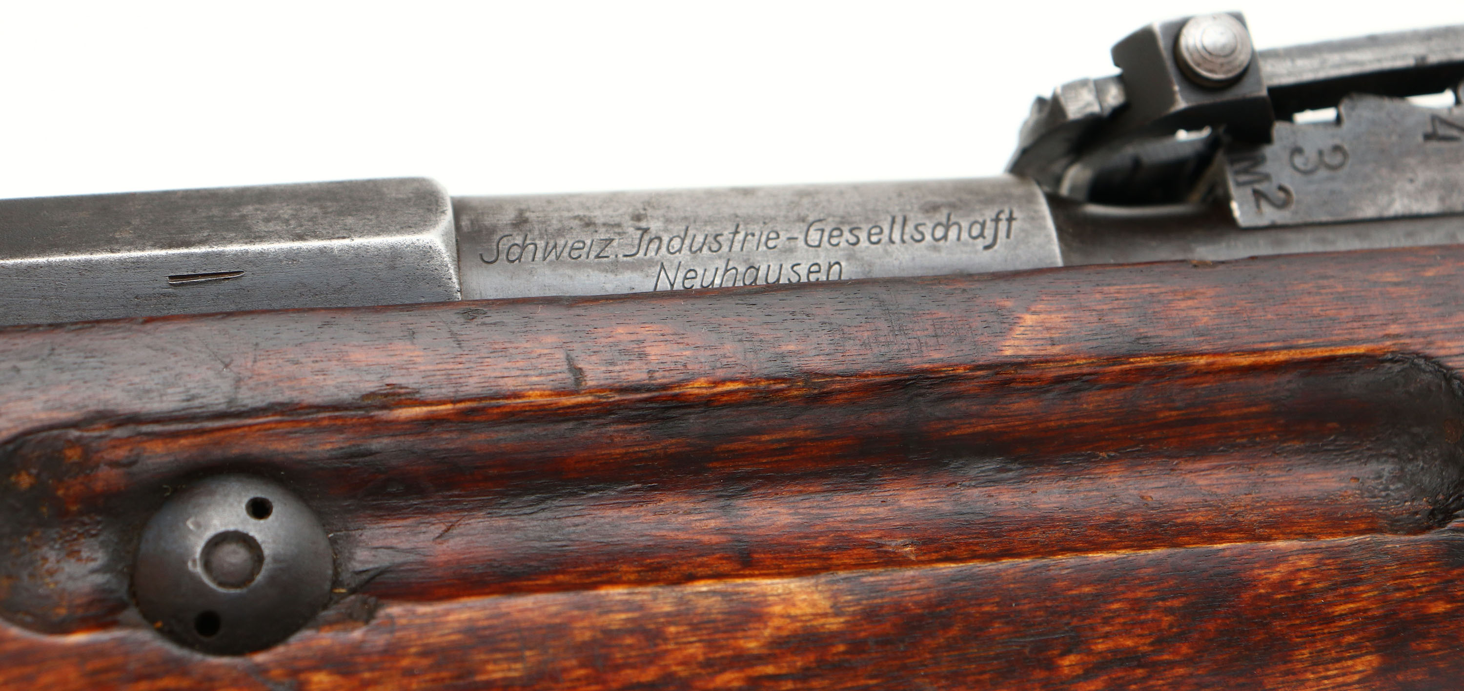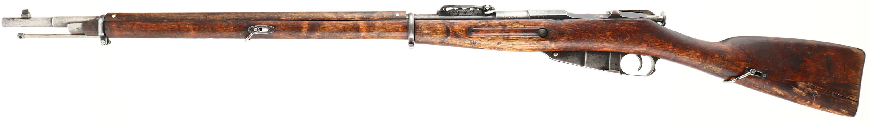 CONDITION: The straight wrist, artic birch stock is very good with nicks, dings, chips, scuffs, & wear from use/age. Small chips by the rear rivets on the upper handguard. Stock has a toe replacement, either done when it was refurbished into a M24, or later arsenal repair. Has the period correct rounded finger splice joints. The metal is mostly worn gray with areas toned brown on the receiver & brown patina speckling. The left side of the receiver is marked with the S/N. the top of the receiver band is marked with a half faded M, a buffed/worn Imperial Russian eagle, & the lined-out number 24482. Left side of the barrel is marked with the S/N, & the SA in box, Finnish army property mark. Top of the barrel is marked with the Civil Guard crest of an S topped with three fir sprigs in a shield. The right side of the barrel is marked Schweiz-Industrie Gesellschaft, Neuhausen. The bottom of the receiver tang is marked with a very faint Tula hammer, no mfg. mark visible. Has a S/N forced matched bolt; all bolt parts marked with Izhevsk stamps. Other parts are of mix of MFGs, very common on Finnish Mosins. The bore is good. Its bright with constant light roughness throughout & lightly thinned rifling. Has been counter bored. The barrel holds a notched barleycorn front sight with a Konovalov V-notch rear sight. The arshins sight markings on the left side of the base have been crossed out, with new sight markings in meters on the right side, also a 200-meter notch was added to the base by the fins. This sight marking change Is seen on practically all Finnish Mosins. The stock carries a steel buttplate, worn gray. Stock has the Russian sling wells with Finnish sling bars. Rifle has a cleaning rod. A good example of a well-worn/used, but still perfectly functional Finn Mosin. FFL or C&R Req - Value: 500 to 1000