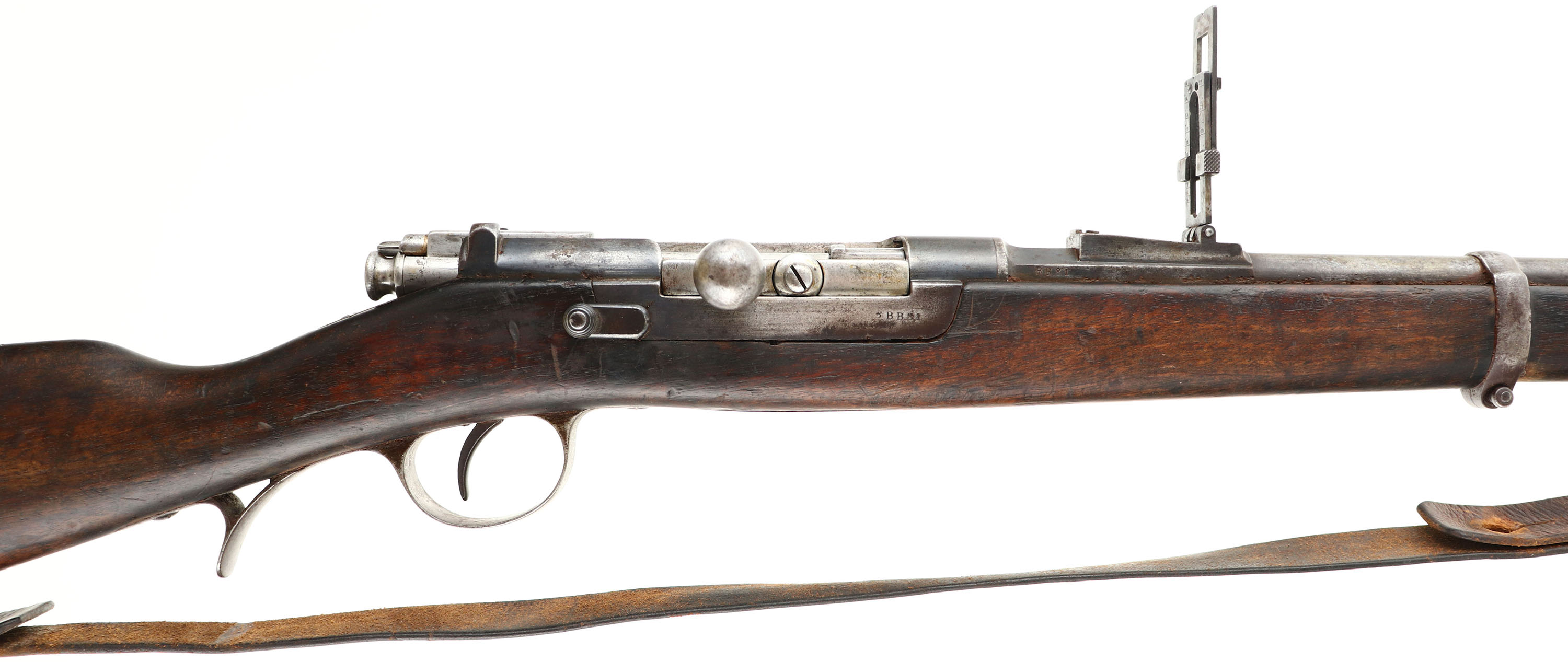 CONDITION: The straight wrist wood stock is good. Stock has nicks, dings, dents, scratches & wear from use/age. Stock has darkened from added oils over the years. Bottom of the stock has a 3 crack emanating from the trigger guard. Wood has shrunk around toe & buttplate is proud to wood. Right cheek of stock is marked with the monarchs cypher roundel, it would read with the model number (M1886) over the MFG & date of MFG (STEYR 1886), with ''OE.W.G.'' in the middle. Marking is worn & is illegible but is still visible. Left cheek is marked with a faded large round cartouche & the S/N ''BB81''. The trigger guard extends out to a pistol grip style finger rest. The metal has mostly worn gray with spots of thinned finish in protected areas, & speckling of brown patina. There is rust & pitting around the stock line. The left side of the receiver is marked ''OE.W.F.G. STEYR'', ''1886'', Crown over a banner over ''L.I'', ''M.1886''. the right side of the receiver & barrel are marked with the S/N. the top of the barrel is marked with a small crown proof. S/N mismatched bolt, the components are also a mix of S/Ns. the bore is very good. Its bright with spots of light roughness. The barrel holds a barleycorn front sight with a flip up ladder, V-notch rear sight marked 6 to 22. The stock carries a steel buttplate, toned brown with roughness. Rifle has both slings loops, cleaning rod, & comes with a brown leather sling marked ''J.BUROY'', ''SELLIER'', ''CUGY''. Antique, no FFL Req. - Value: 350 to 700