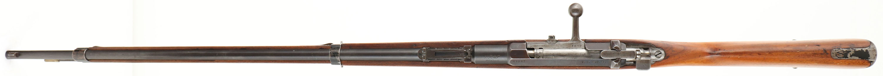 HISTORY: The story of this rifle starts with Antonio Dovitiis, he was a Italian tailor and merchant of military supplies in Montevideo, who wound up with the job of procuring some new arms for the Uruguayan military. He got a bunch of single shot 11mm Mauser 1871 rifles, obsolescent by the 1890s. In 1895 he made a deal with the St. Denis arsenal in France to re-barreled 10,000 Mauser 71 rifles to the new French 6.5mm Daudeteau Cartridge, a high velocity smallbore, smokeless round. When they were made they were switched from rifles to carbines, carbines to rifles, & no rematching of parts made, making most of them having mixed parts. When Uruguay received these rifles they were not too please & wasn't really what they were looking for. They were quickly scrapped & Uruguay made some room in their budget & bought new M1895 pattern Mausers. A unique rifle with a mix of German & French markings for the Uruguay army.