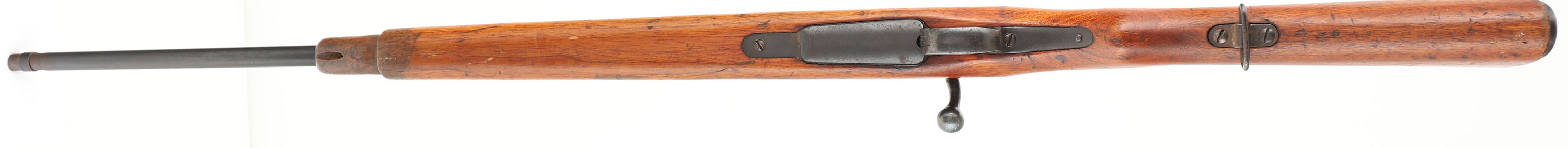 Tokyo Arsneal, Type 38, Cal: 6.5x50mmR, MFG: 1906-20's, S/N: 1205259, Bolt action rifle, 25'' barrel. The semi-pistol grip Japanese walnut stock is very good as being cut down, lightly sanded & oiled. The belly of the stock is marked with three Japanese character cartouches. The blued metal finish rates 85% overall with spots of thinning & rust speckling. The left side of the receiver is marked with the S/N, Tokyo Arsenal logo, & two small inspector stamps. The top of the receiver band is marked with a fully intact chrysanthemum, & ''TYPE 38'' in Japanese characters. The rear receiver bridge is marked with a small triangle in circle stamp & a small circle stamp. The left side of the barrel is marked with a small triangle in circle stamp, & ''S''. The bolt handle has grind & weld marks & has been bent down crudely. The bolt handle hits the stock before fully locking into battery & will not fire, the stock either needs shaved, or bolt handle needs fixed. The bore is very good. Its bright with strong rifling, but has light roughness. The barrel holds a barleycorn front sight with a flip up ladder V-notch rear sight marked 6 to 24. the stock carries a blued steel buttplate, has spots of rust. Rifle has rear sling swivel. FFL or C&R Req. - Value: 100 to 200