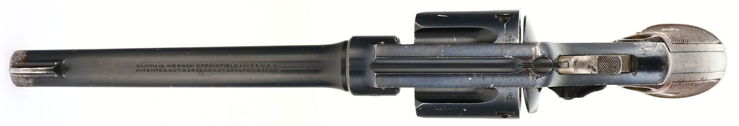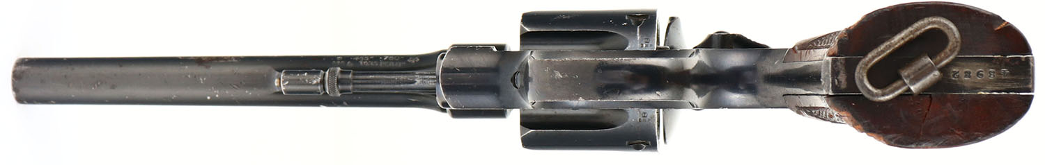WWI Smith & Wesson, MK II Hand Ejector, CAL: 455, MFG: 1908-15, SN: 48982, Double Action Revolver, 6 1/2'' barrel. The original S&W logo medallion checkered wood grips are good. The right grip has a crack from bottom to top & there are other contusions, dings & scrapes throughout. The original metal blue finish rates 85% overall. There are a couple areas of concentrated pitting/loss on the muzzle & frame knuckle, a long with other minor handling marks throughout. Bore is excellent. U-notch rear sight & tall round blade front sight.