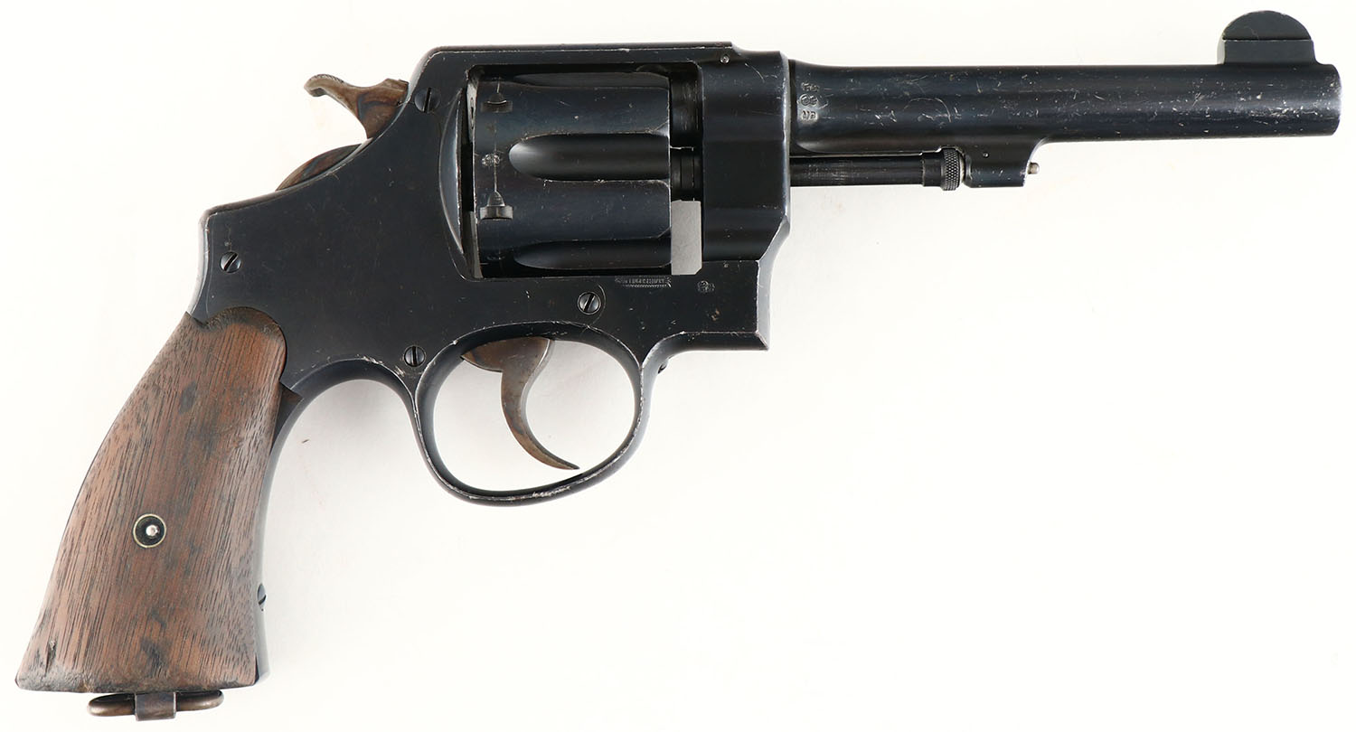 WWI, Smith & Wesson, US Army Model 1917 - England Lend Lease, CAL: 45 ACP, MFG: 1918, SN: 96804, Double Action Revolver, 5 1/2'' barrel. The original smooth wood grips are very good & solid. The top front corner of the right grip has an edge chip, along with other contusions & dings throughout. The original metal blue finish rates 95% overall, with intermittent chatter marks & light spotting, toned to a brown patina. Bore is excellent. The case-hardened trigger & hammer retain excellent case-colors. U-notch groove rear sight & tall round blade front sight. Standard S&W address & patent dates on the barrel. British proofs can be seen on the right side of the frame, barrel & on the cylinder. The right side of the frame is marked ''NOT ENGLISH MAKE''. US proofs can be seen on the left side of the frame & inside cylinder housing. The butt is marked ''US ARMY MODEL 1917 No. 96804. (Credit: Pistols of World War I by Robert J. Adamek) '' Only several thousand 1917's were sent to England during the great war and are not commonly encountered.'' FFL or C&R Req. - Value: 1200 to 1800