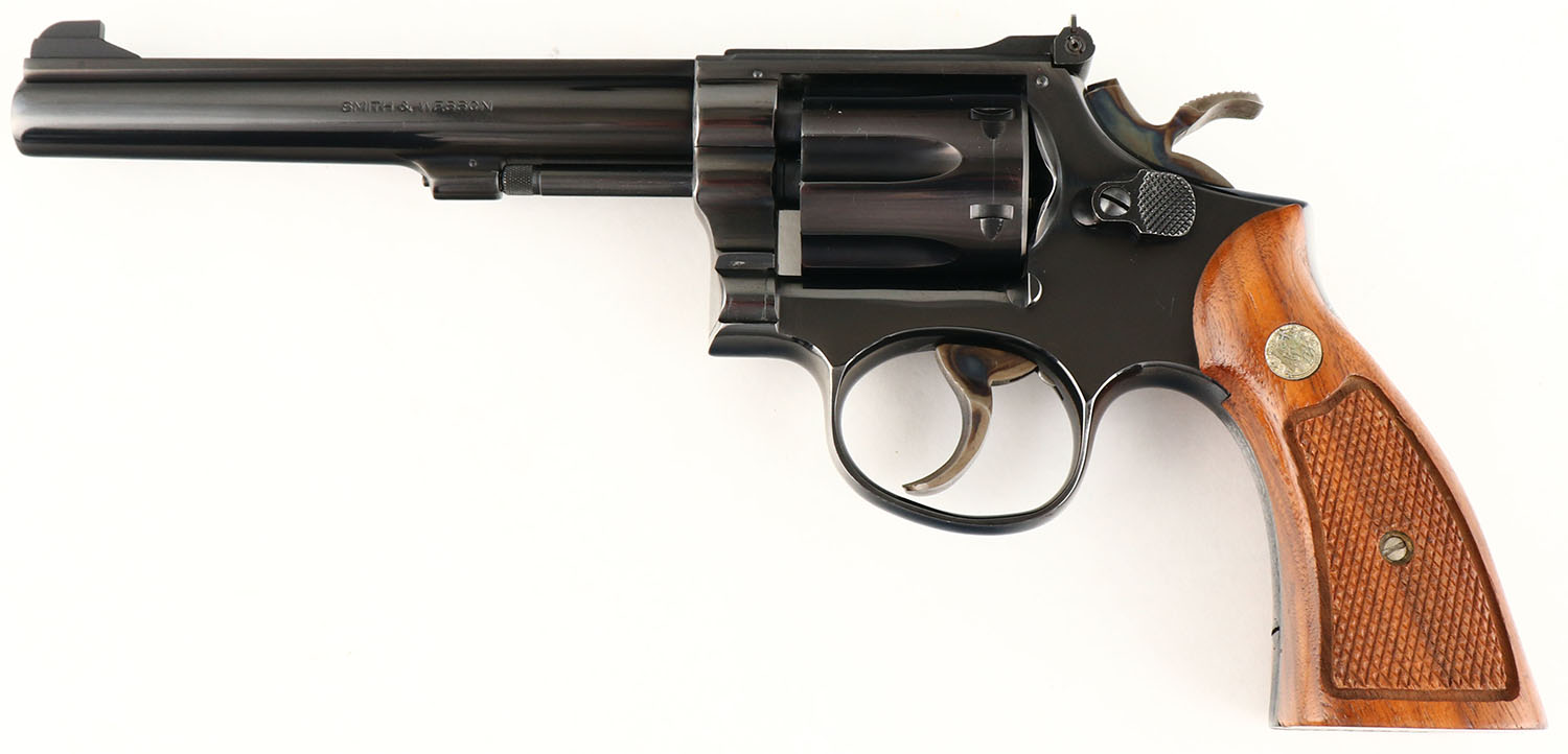 BOXED, Smith & Wesson, Model 17-3, CAL: 22LR, MFG: 1973, SN: 5K9953, Double Action Revolver, 6'' barrel. The S&W logo medallion checkered wood grips are excellent, near mint. The original metal blue finish rates 99%+ overall. The case-hardened hammer & trigger retain vivid case-colors. Bore is excellent. Adjustable rear sight & ramp elevated partridge front sight. Comes in original box, with related paperwork, cleaning rod/tips & wax paper.* FFL or C&R Req. - Value: 900 to 1300