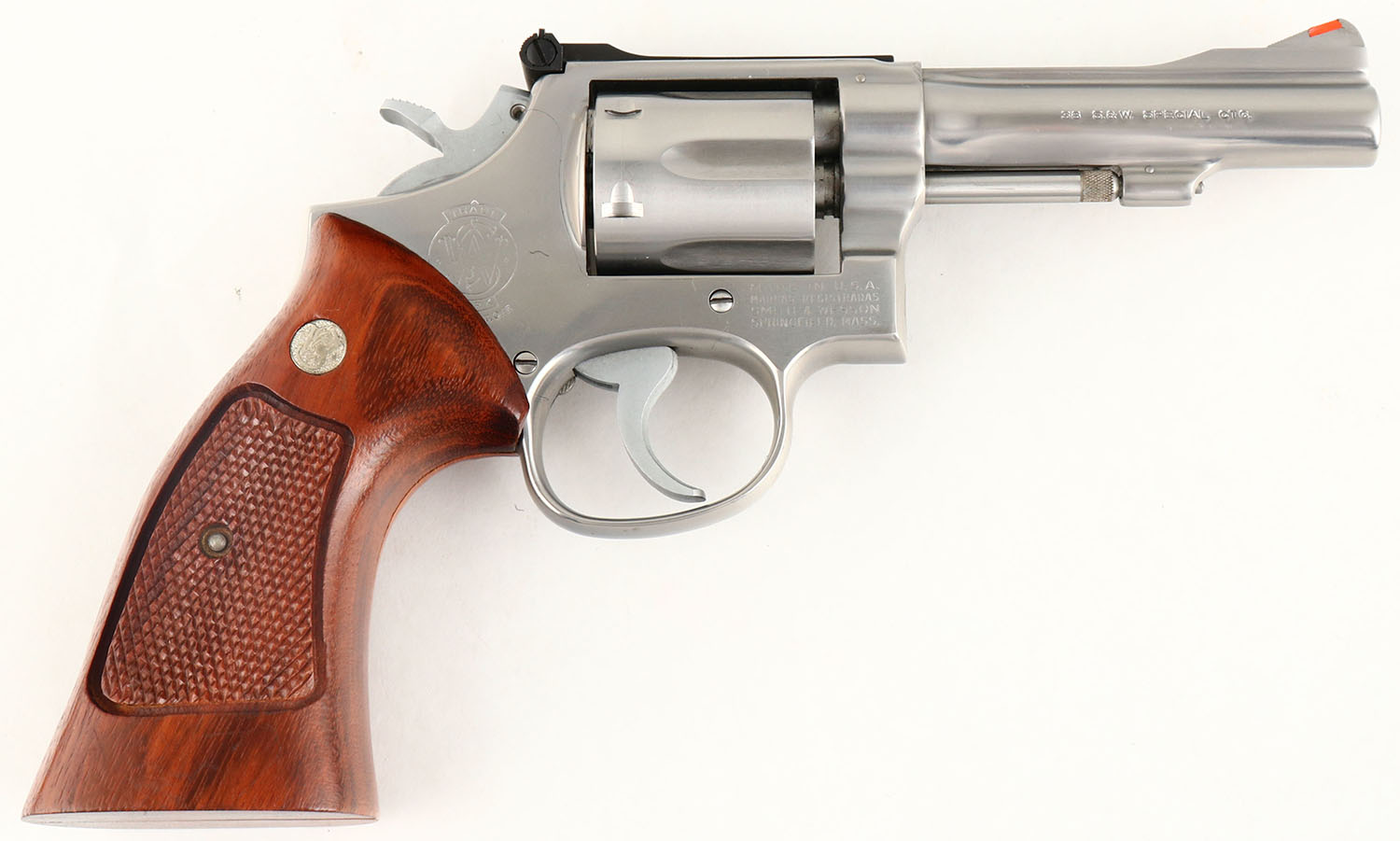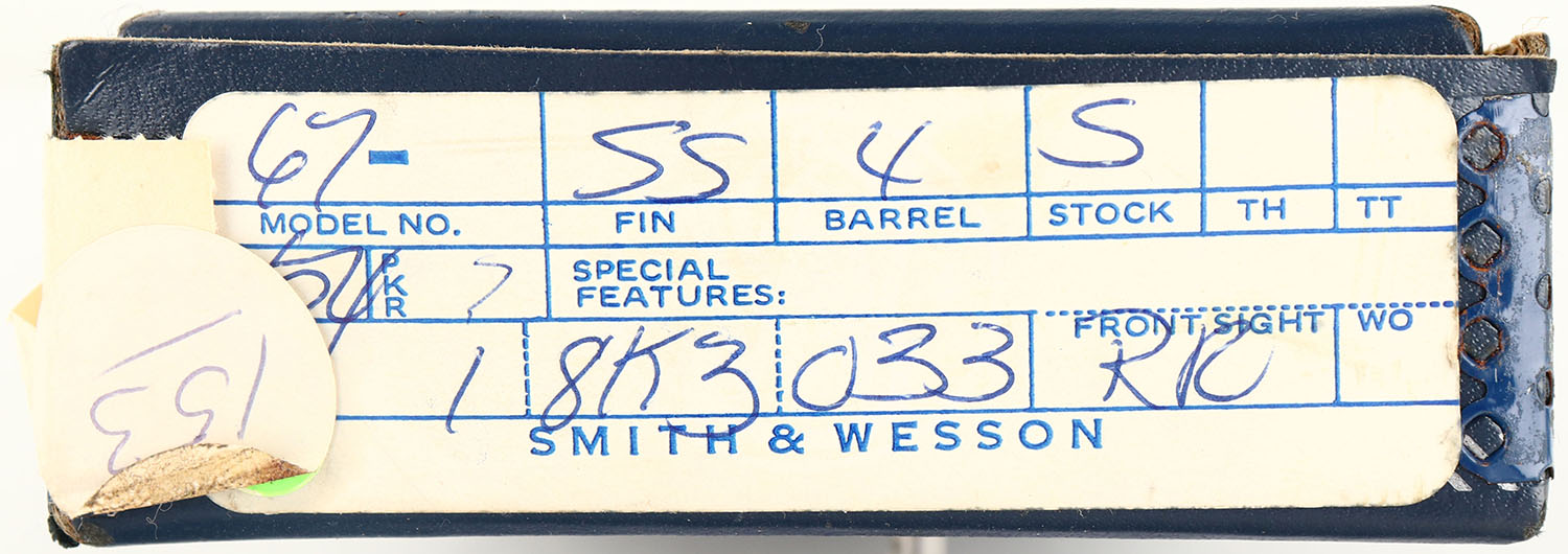 BOXED, Smith & Wesson, Model 67, CAL: 38 S&W SPL, MFG: 1977, SN: 18K3033, Double Action Revolver, 4'' barrel. The S&W logo medallion checkered wood grips are near mint. The brushed stainless steel finish is excellent overall, having been cleaned & buffed. Some of the markings on the right side of the frame are thin. Bore is excellent. Adjustable rear sight & ramp elevated serrated blade front sight, with orange insert. Comes in original box with related paperwork, cleaning rod/tips & wax paper. FFL Req. - Value: 500 to 700