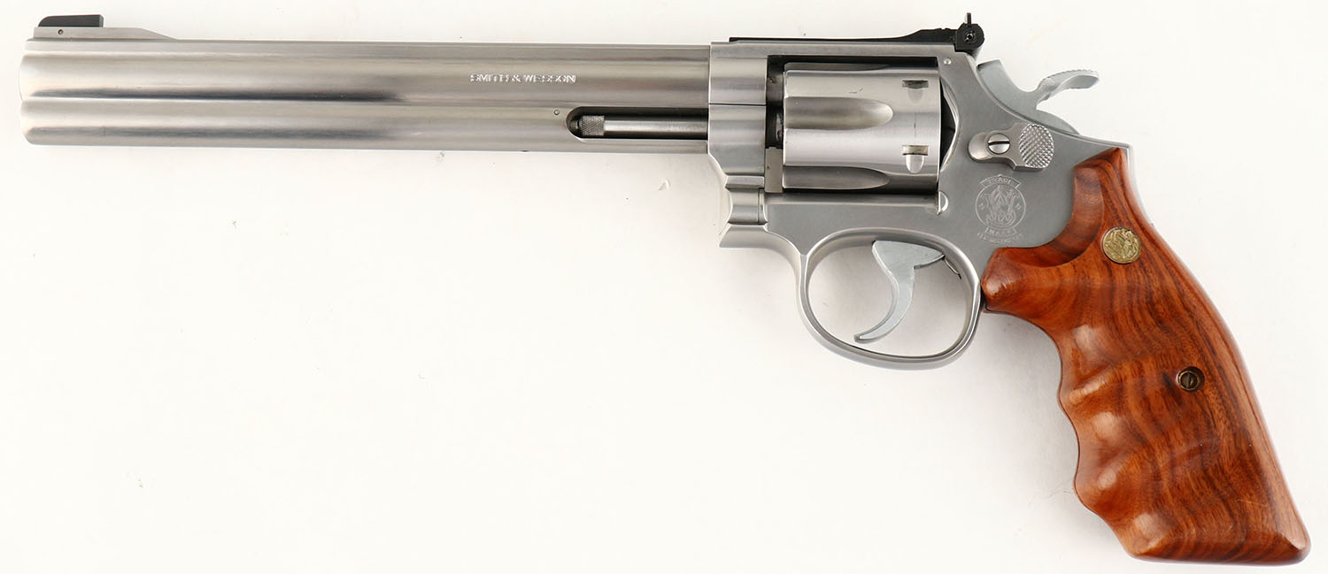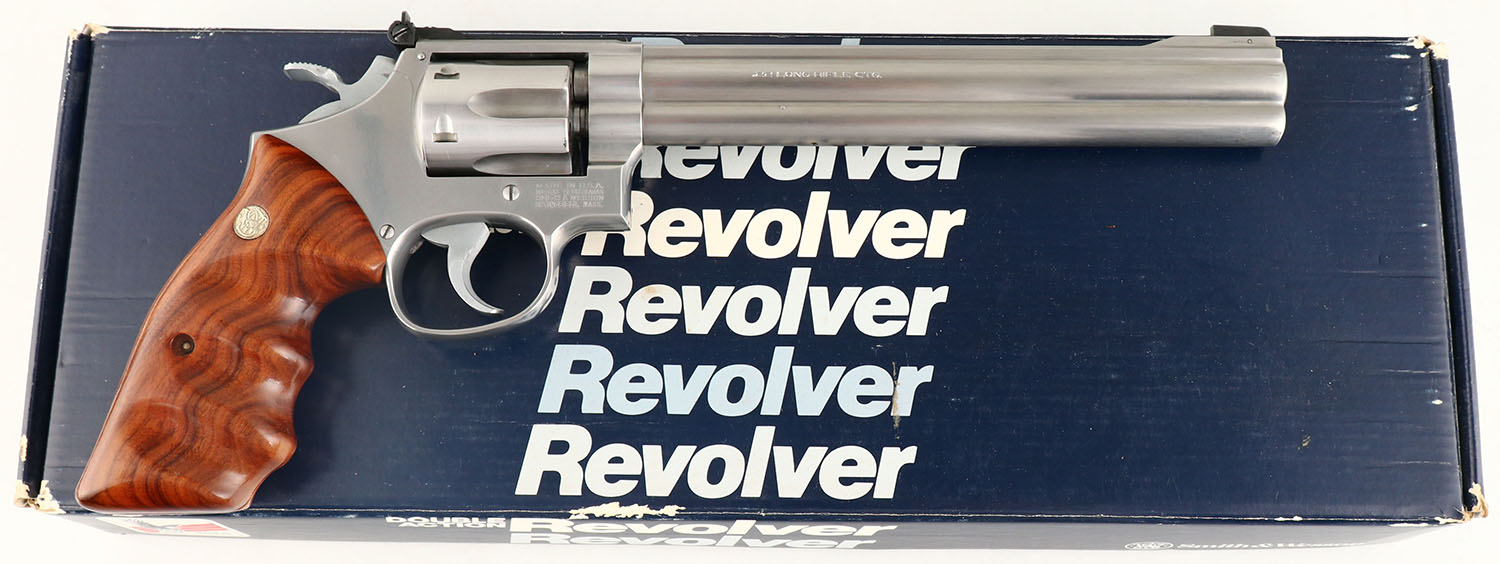 BOXED, Smith & Wesson, Model 617 (No Dash), CAL: 22LR, MFG: 1989-92, SN: BHN6660, Double Action Revolver. 8 1/4'' barrel. The S&W logo medallion ergonomic wood grips are excellent. There are only minor handling marks to the high gloss finish. The stainless steel finish is excellent, with visible thin brush lines; consistent amongst stainless steel finishes. Bore is excellent. Adjustable rear sight & ramp elevated blade front sight. Comes in factory box. FFL Req. - Value: 700 to 1200
