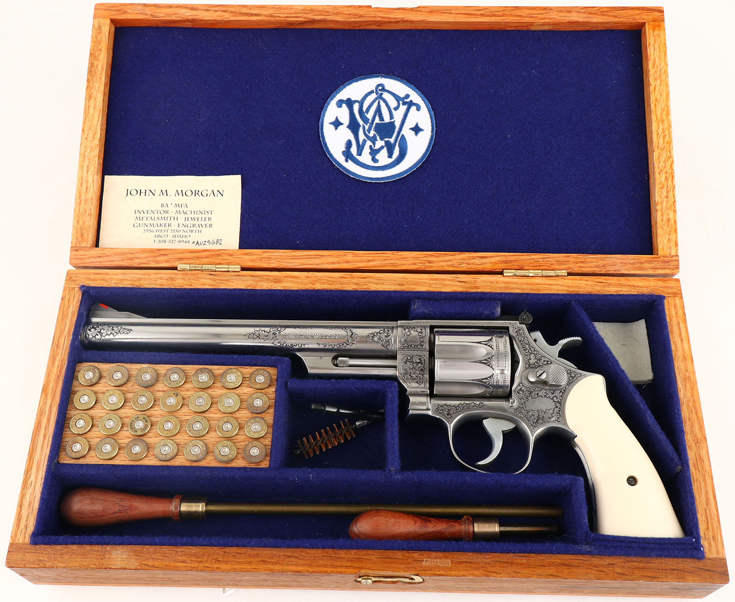 CASED, Smith & Wesson, Model 629-1, CAL: 44 MAG, MFG: 1982, SN: AUZ9682, Double Action Revolver, 8 1/2'' barrel. This revolver has been tastefully & intricately engraved in a floral & scroll pattern by John M. Morgan of Arco, ID. The simulated ivory grips are excellent. The polished stainless steel finish is excellent, with visible thin brush lines. Bore is excellent & bright with crisp rifling. Adjustable rear sight & ramp elevated blade front sight with orange insert. Comes in a hand crafted oak case, with blue cloth interior & the S&W logo on the lid. Included in the case are cleaning tools & (28) fired brass shells in a wood ammo block. An excellent example of an engraved S&W revolver. FFL Req. - Value: 2000 to 4000