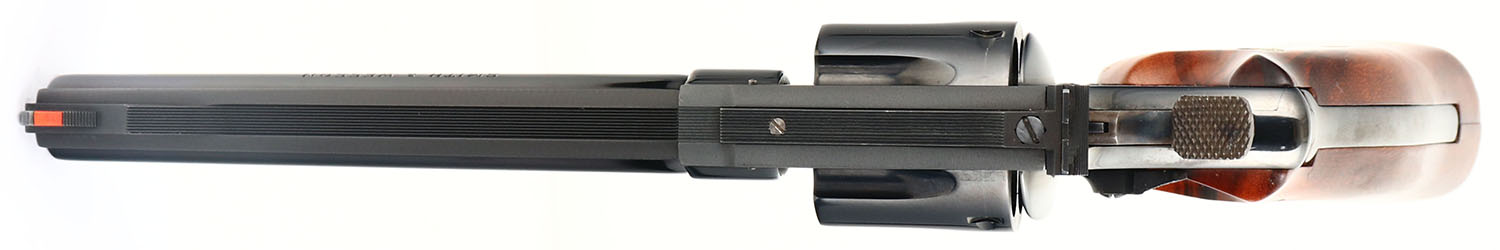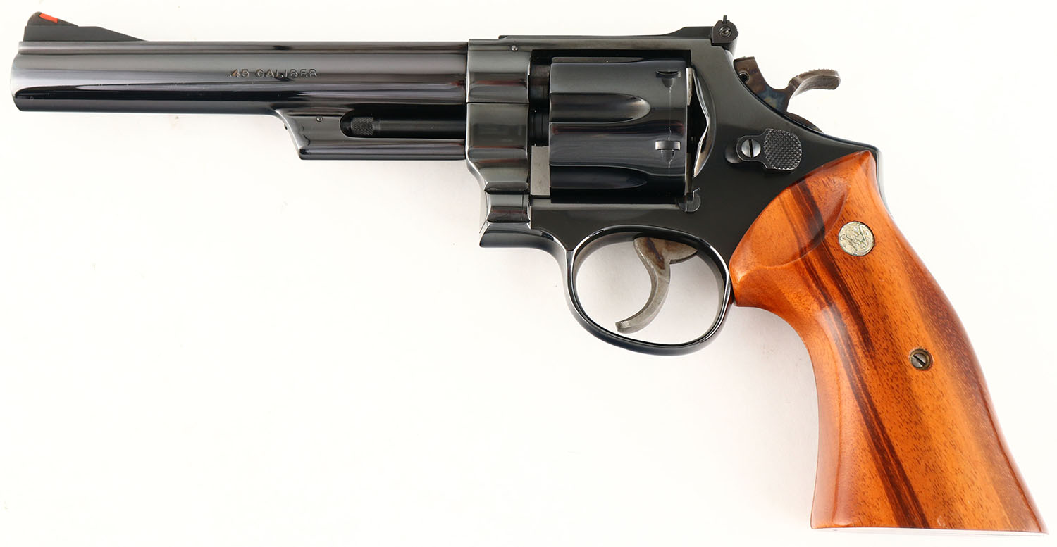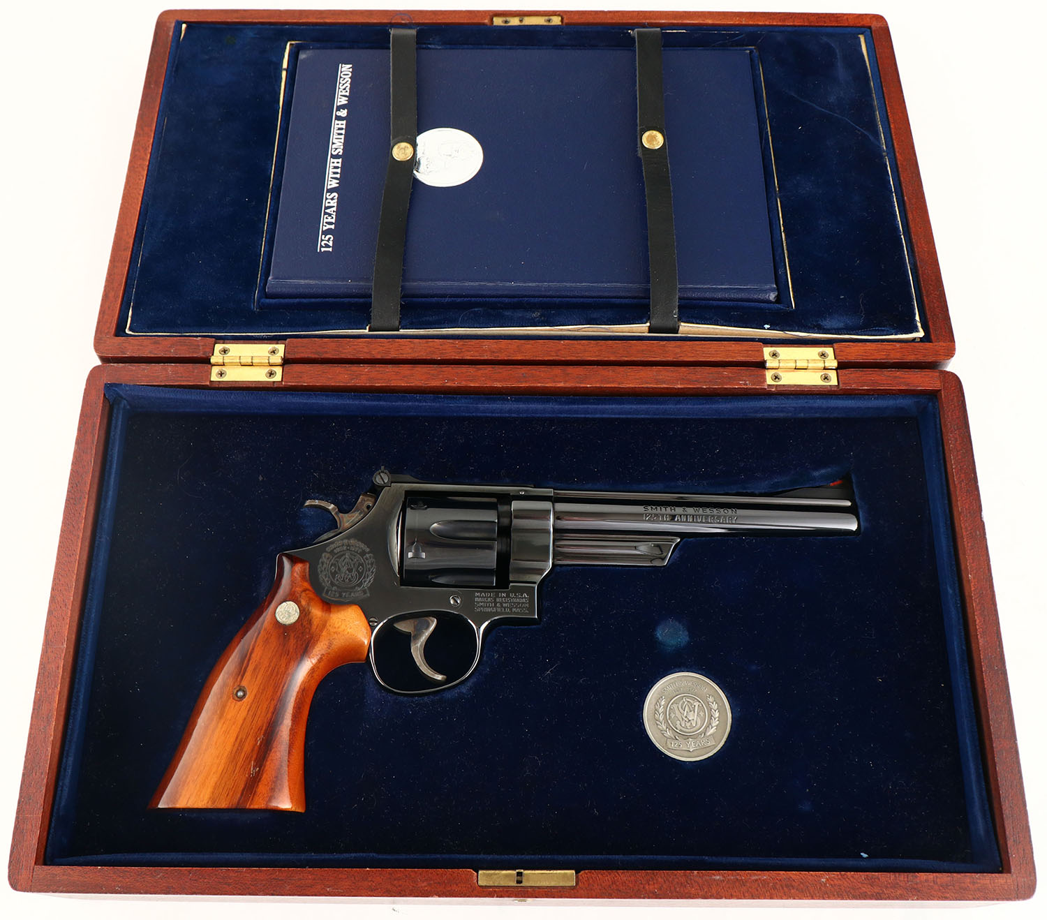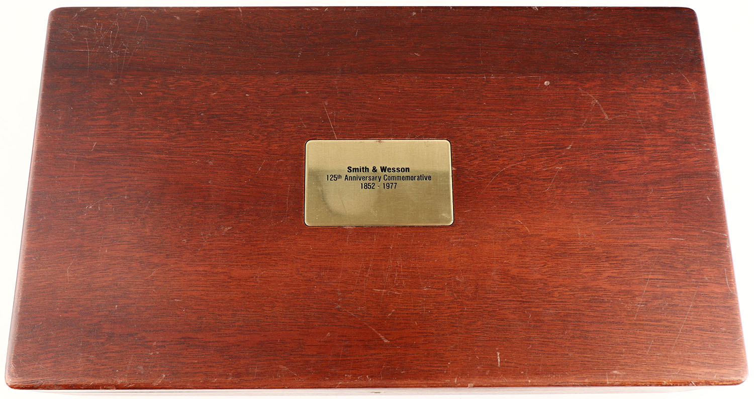 CASED, Smith & Wesson, Model 25-3 125th Anniversary Edition, CAL: .45 LC, MFG: 1977, SN: S&W9788, Double Action Revolver, 6 1/2'' barrel. The S&W logo medallion Goncalo Alves smooth wood grips are excellent. The metal blue finish rates 99% overall. Bore is excellent. Adjustable rear sight & ramp elevated serrated blade front sight, with orange insert. The right side of the barrel is marked in two lines ''SMITH & WESSON 125TH ANNIVERSARY'', the left side of the barrel is marked ''.45 CALIBER'' & the 125th Anniversary seal can be found on the right side of the frame. The revolver is accompanied by ''125 Years of Smith & Wesson'' book by Roy G Jinks, inside a S&W 125th Anniversary Presentation case, with commemorative medallion. The case & accessories are excellent. A complete 125th Anniversary set. Only 10,000 produced. FFL or C&R Req. (C&R Eligible Commemorative) - Value: 1000 to 1500