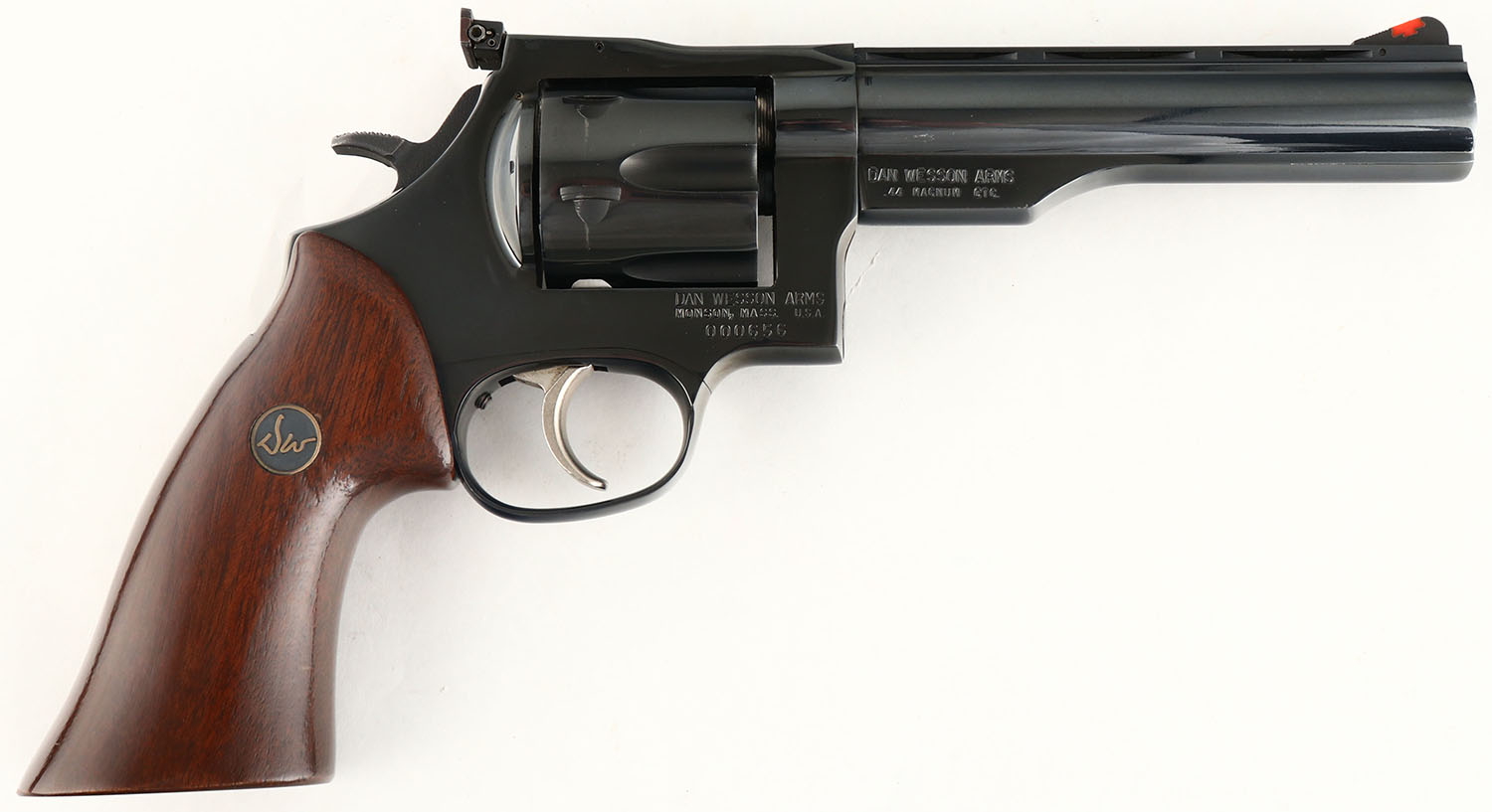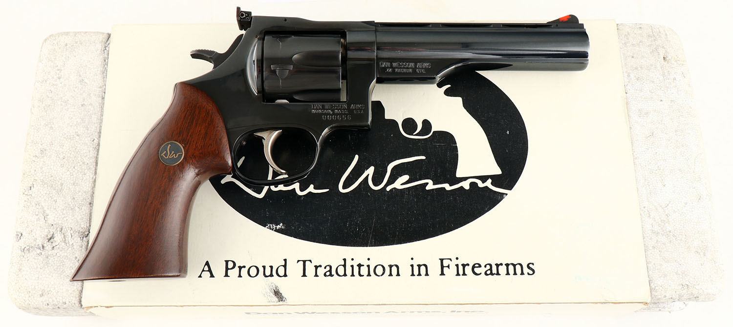 BOXED Dan Wesson Arms, Model 44V, CAL:.44 MAG, MFG 1968-1991, SN: 000656, DA Revolver Pistol, 6'' barrel The DW logo medallion smooth wood grips are excellent. The original metal blue rates 98%, and while there is little to no loss, there is some discoloration to the bluing. Bore is excellent. Adjustable rear sight & serrated blade front sight, with orange insert. Comes in factory styrofoam, with cardboard sleeve. Box has related paperwork, tool, barrel gauge tool & paperwork. FFL Req. - Value: 700 to 1000