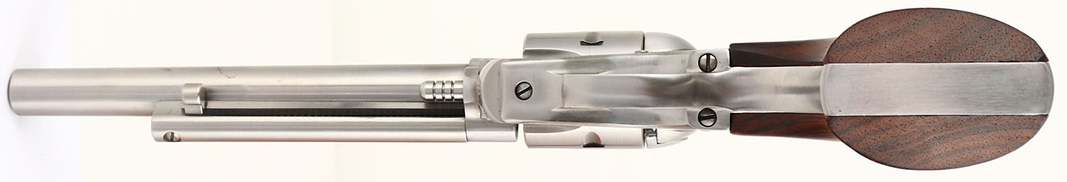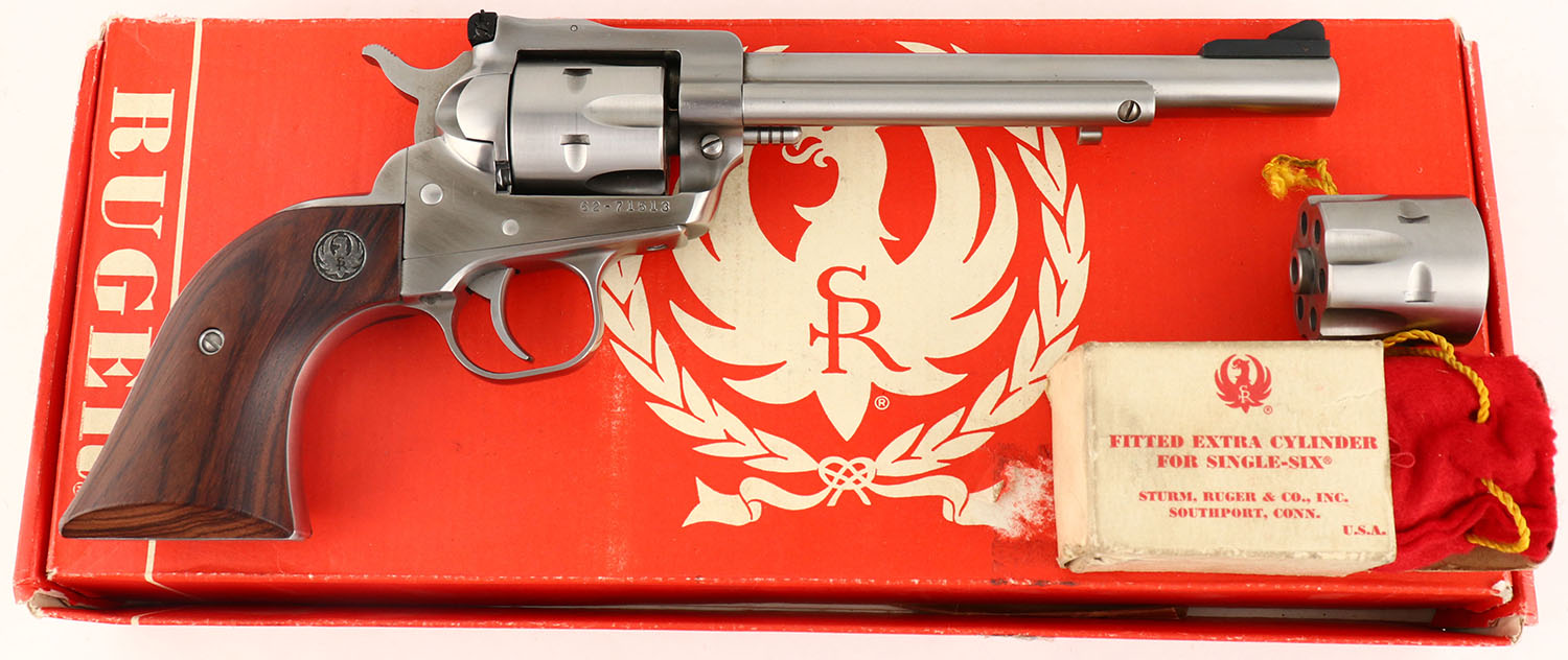 BOXED, Ruger, New Model Super Single Six Convertible, CAL: 22LR/22MAG, MFG: 1974, SN: 62-71513, Single Action Revolver, 6 1/2'' barrel. The Ruger logo medallion wood grips are excellent. The logo medallion has some spotting & light corrosion. The stainless steel finish is excellent overall. Bore is excellent. Adjustable rear sight & elevated serrated blade front sight. Comes in original box, with related paperwork, wax paper & .22 MAG cylinder in original pouch. FFL or C&R Req. - Value: 400 to 600