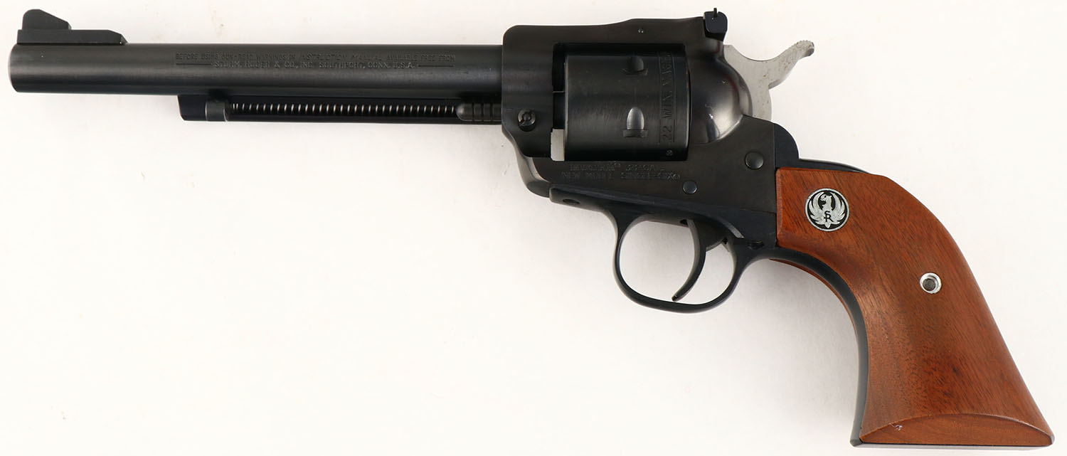 Ruger, New Model Single Six Convertible, CAL: 22LR/22 MAG, MFG: 1979, SN: 67-01295, Double Action Revolver, 6 1/2'' barrel. The Ruger logo medallion wood grips are excellent. The original metal blue finish rates 99%. Bore is excellent. Adjustable rear sight & elevated serrated blade front sight. Comes in a period correct box, with incorrect Blackhawk label printed on the box, no label & outer cardboard sleeve. Box has related paperwork, wax paper & .22 LR cylinder in factory pouch. FFL or C&R Req. - Value: 450 to 650