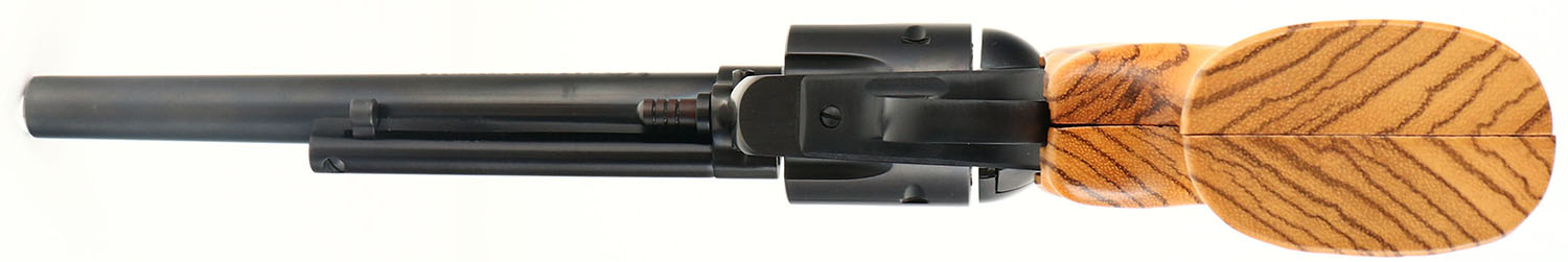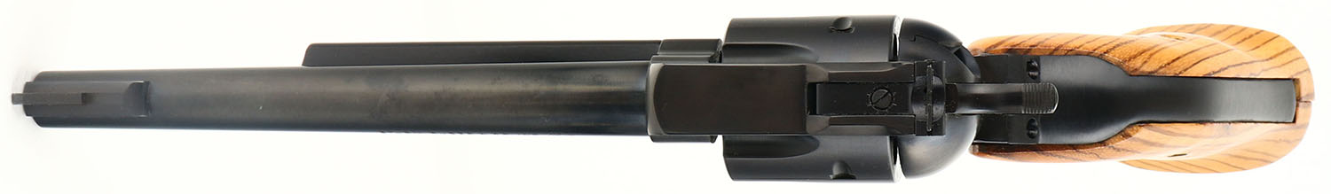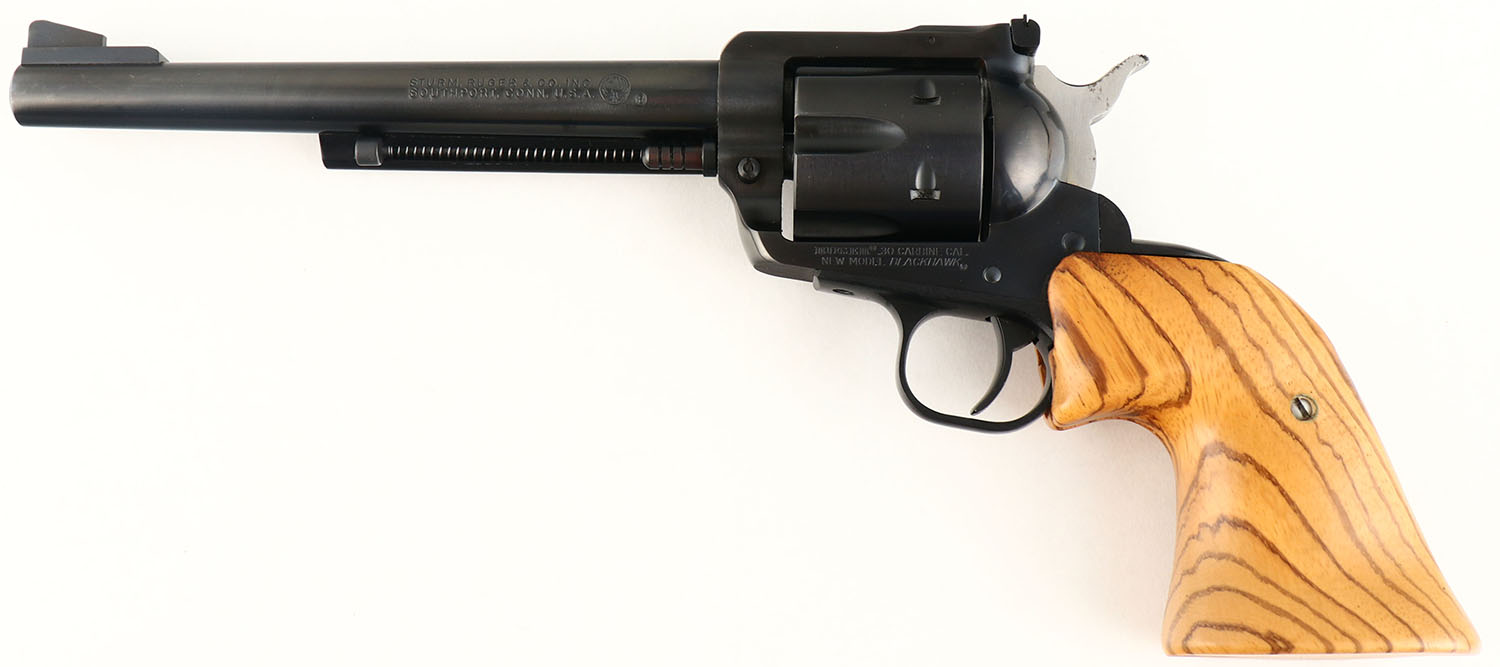 Ruger, New Model Blackhawk, CAL: 30 Carbine, MFG: 1977, SN: 51-11789, Single Action Revolver, 7 1/2'' barrel. The oversized replaced wood grips are excellent. The original metal blue finish rates 99% overall. Bore is excellent. Adjustable rear sights & block elevated serrated blade front sight. FFL Req. - Value: 550 to 750