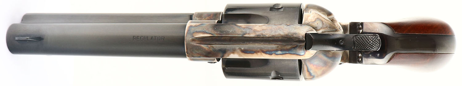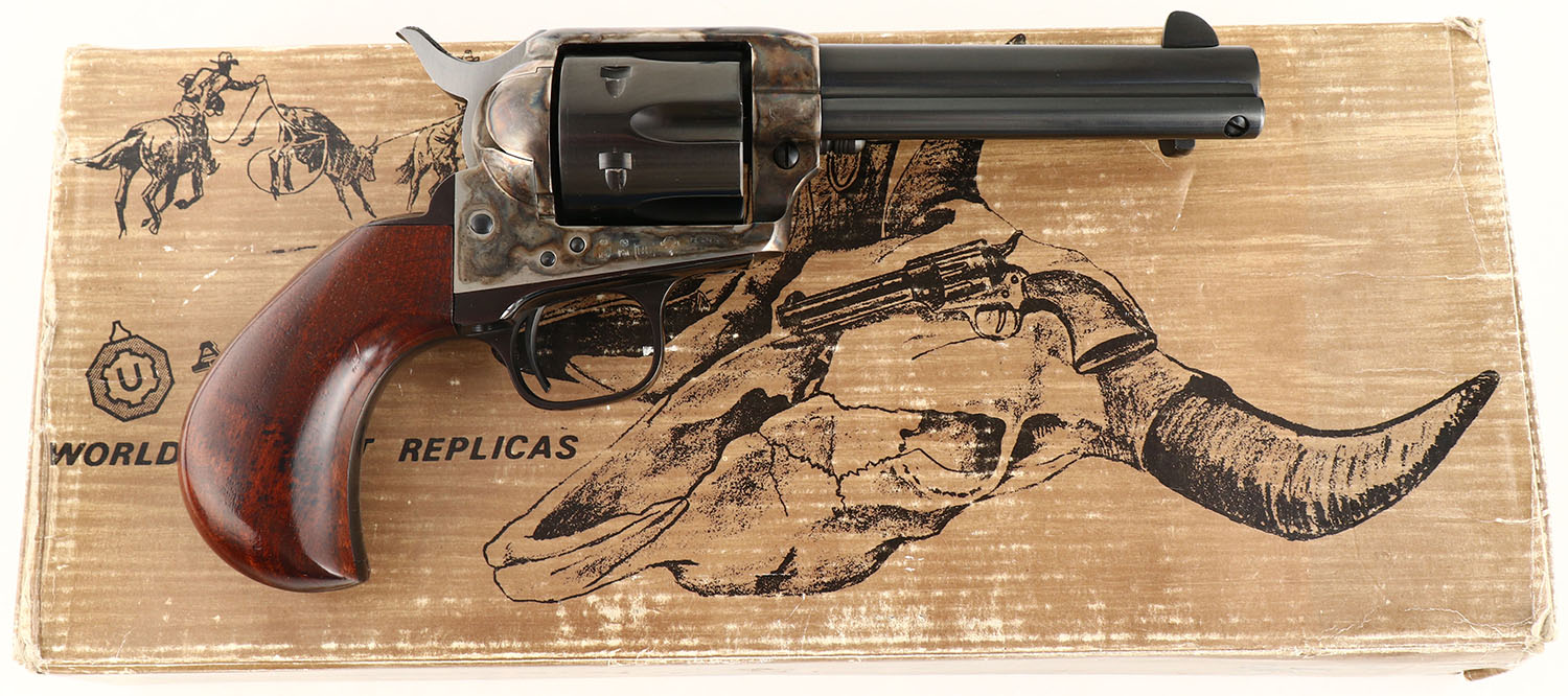 BOXED, American Arms Inc. (Uberti), Regulator, CAL: 44-40, MFG: Modern, SN: 117167, Single Action Revolver, 4 3/4'' barrel. The wood grips are excellent. The metal blue finish on the barrel, cylinder, & trigger guard rates 99%. The case-hardened frame retains excellent case-colors. Bore is excellent. Integral v-notch rear sight & blade front sight. Comes in original box. FFL Req. - Value: 250 to 450
