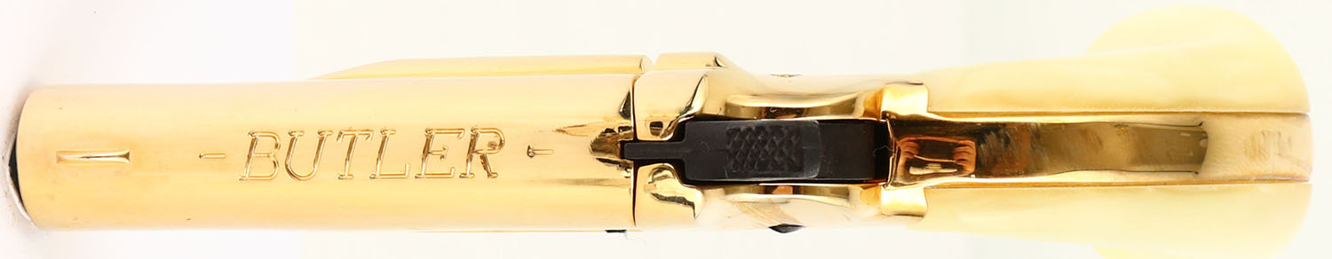 BOXED, Butler, Derringer, CAL: 22 SHORT, MFG: Modern, SN: B47048, Single Action Pistol, 2 3/8'' barrel. The faux pearl grips are excellent. The high polish gold tone finish rates 99% overall, with minor speckling on the left side of the barrel. Bore is very good. Blade front sight. Comes in factory box. FFL Req. - Value: 50 to 150