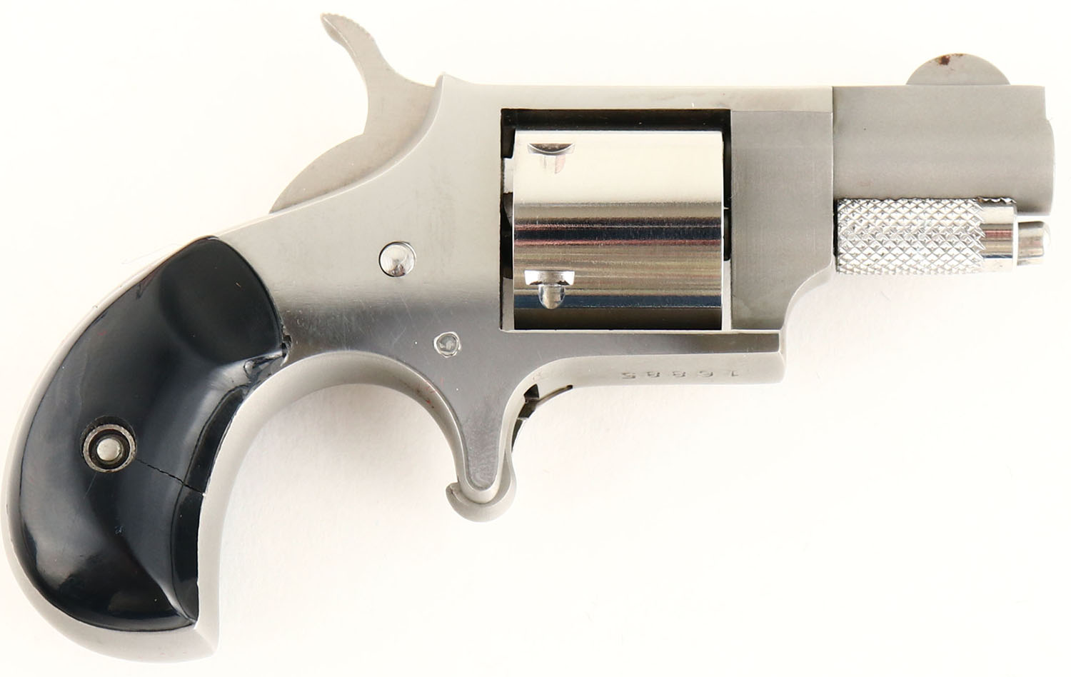 BOXED, North American Arms, Model NAA-22-S, CAL: 22 SHORT, MFG: Modern, SN: 16885, Single Action Revolver, 1 1/8'' barrel. The black plastic grips are good. Both grips have cracks running from front to back, going through the screw hole. The two-tone stainless steel finish is excellent overall. Bore is excellent. Small blade front sight. Comes in cloth covered hard case, with red interior & outer cardboard sleeve. FFL Req. - Value: 100 to 200