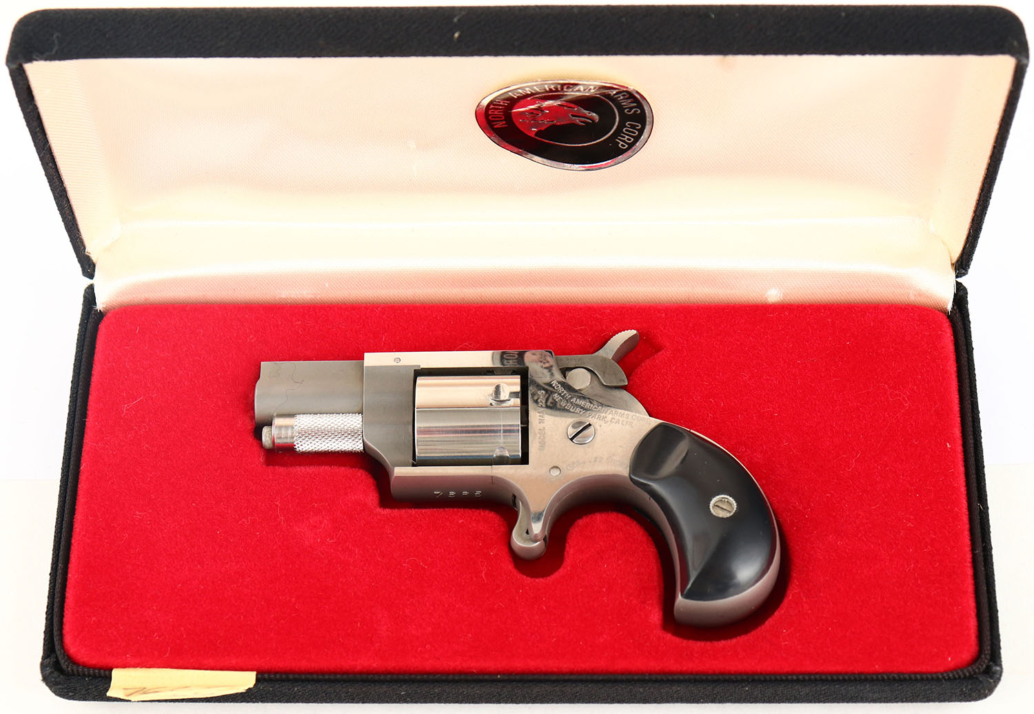 BOXED, North American Arms, Model NAA-22-S, CAL: 22 SHORT, MFG: Modern, SN: 7665, Single Action Revolver, 1 1/8'' barrel. The black plastic grips are excellent. The two-tone stainless steel finish is excellent overall. Bore is excellent. Small blade front sight. Comes in cloth covered hard case, with red interior & outer cardboard sleeve. FFL Req. - Value: 100 to 200