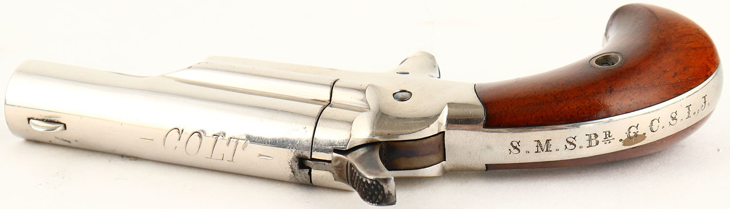 CASED, Colt, Thuer Derringer (3rd Model), CAL: .41 RF, MFG: 1870's-80's, SN: 1589, Single Shot Pistol, 2 1/2'' barrel. The bird's head wood grips are excellent. There are a few minor dings to the finish. The original nickel finish rates 98% overall, with only a couple small spots of flaking. The case-hardened hammer retains excellent case colors. Bore is good, with intermittent spotting & speckling. Blade front sight. The backstrap is engraved, although it can't be attributed to anyone due to lack of evidence from research. The backstrap is engraved with ''S.M.S.B R G.C.S.I.J''. The special order engraving is consistent with examples of Colt factory engraving. Comes in original derringer wood case, with blue interior & Colt label with London address. The case is originally for a pair of derringers, but only one is present. Included in the case is a small plaque that reads ''MAHARAJAH OF JAIPUR''. A high condition Derringer with an untold story. Antique, No FFL Req. - Value: 1000 to 1500