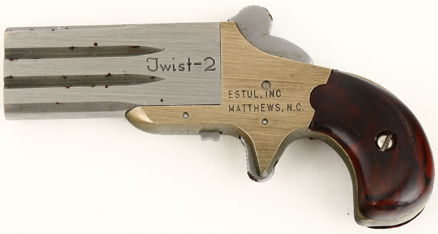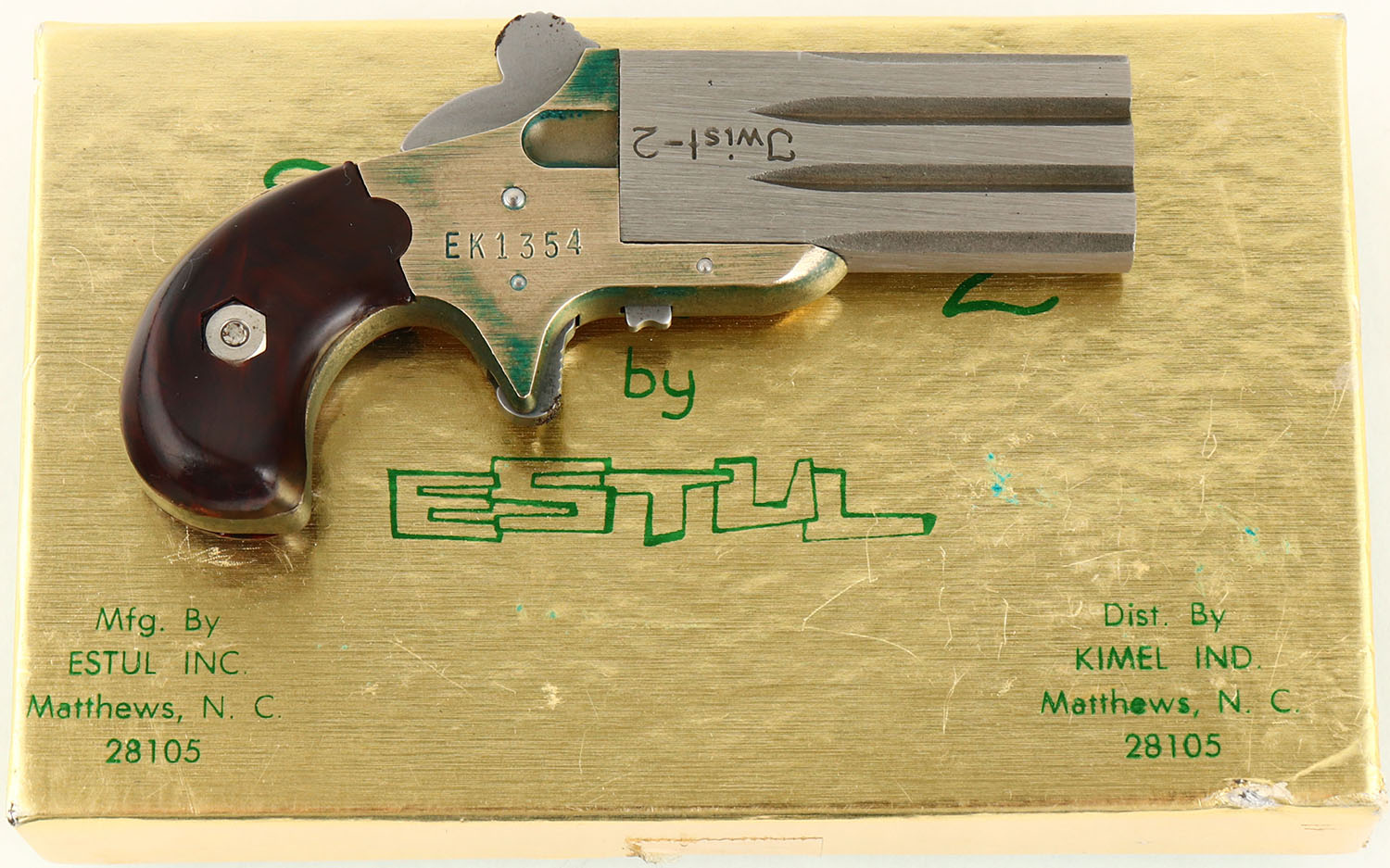 BOXED, Estul, Twist-2, CAL: 22 S, MFG: N/A, SN: EK1354, Single Shot Pistol 2'' revolving barrels. The synthetic faux wood grips are excellent. The brushed stainless steel barrels are very good, with intermittent spotting on one side. The brass frame is very good, with areas of staining on the right side. Bores are very good. No sights. Comes in factory box, with owners manual. FFL Req. - Value: 50 to 150