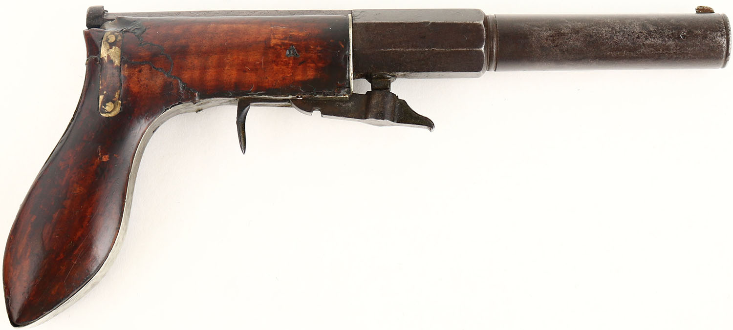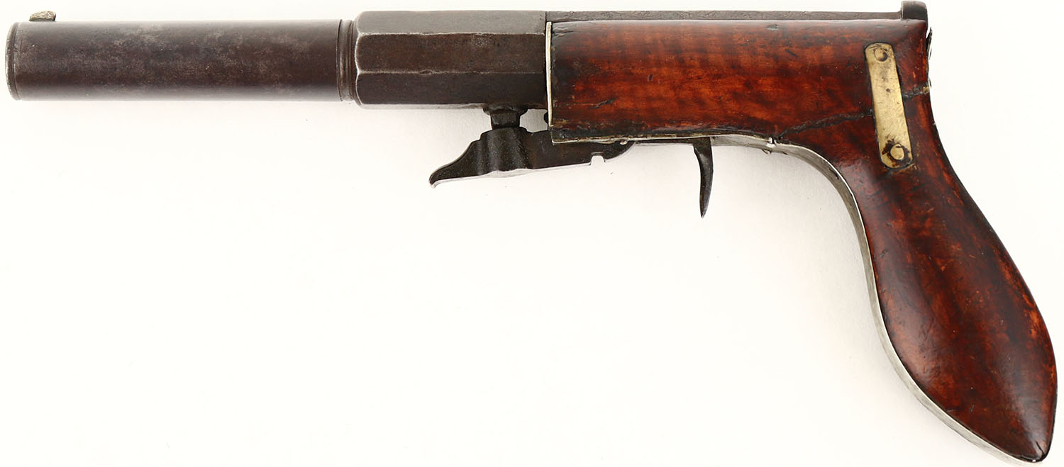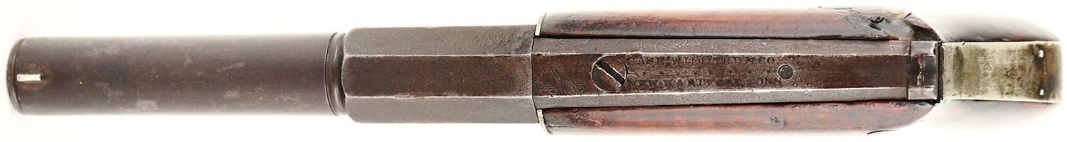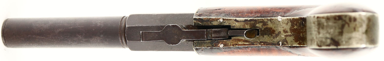 Case Willard N Co., Underhammer Boot Pistol, CAL: 36, MFG: circa 1840, SN: N/A, Percussion Single Shot Pistol, 3 1/2'' half octagon half round barrel. The left flat is clearly marked ''CAST-STEEL / PATENT'' & the upper tang marked with ''CASE WILLARD N CO / NEW-HARTFORD-CONN''. The original wood grip is good. There is an old break at the bend. The break was repaired by two inlaid brass strips. There are some areas with filler, & other minor contusions, scrapes/dings, under an added layer of varnish. The top of the frame has simple decorative engravings. The metal finish has fully worn to metal gray & toned to a brown patina. Bore is poor, dark & pitted. Fixed notch rear sight & small silver blade front sight. Nipple is intact & mechanical functions appear to operate properly. Antique, No FFL Req. - Value: 500 to 800