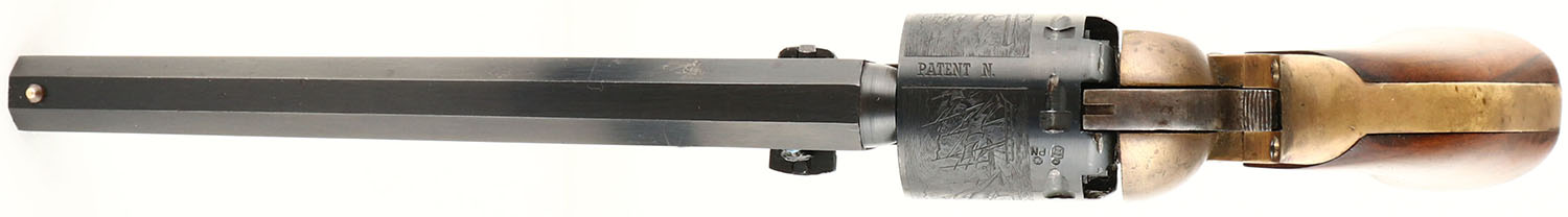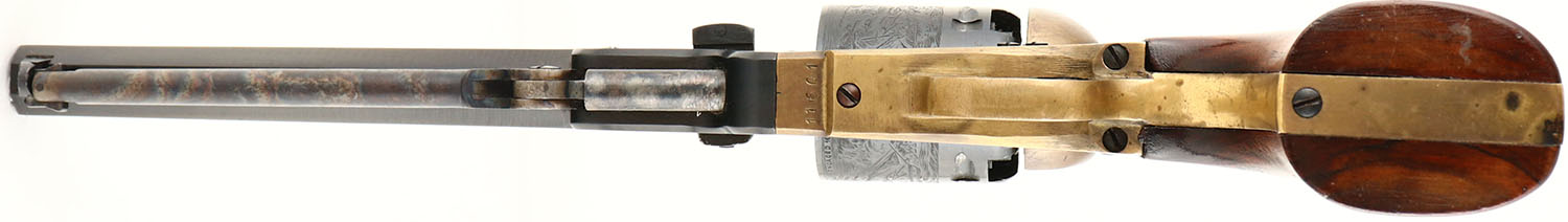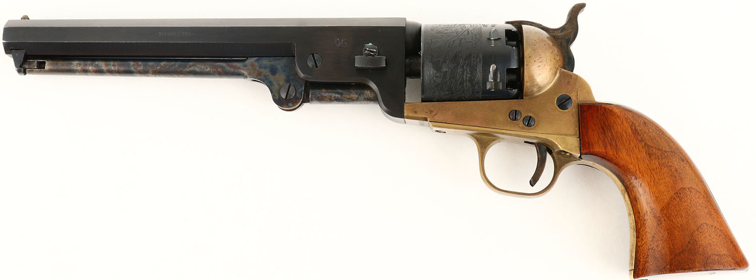 Rigarmi, Model 1851 Navy, CAL: 36, MFG: N/A, SN: 11601, Single Action Percussion Revolver, 7 1/2'' octagon barrel. The original wood grips are excellent. There are minor handling marks to the finish. The metal blue finish on the barrel rates 90% coverage, toned to a brown patina. The brass frame has an aged patina. The case-hardened ramrod retains excellent case-colors. Bore is excellent. Small brass cone front sight. Black powder, No FFL Req. - Value: 100 to 200