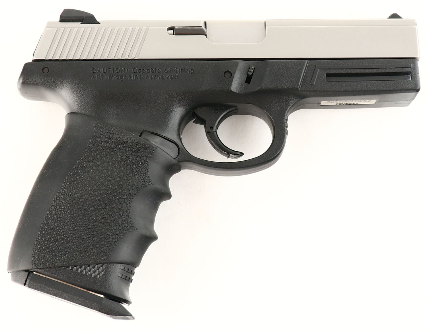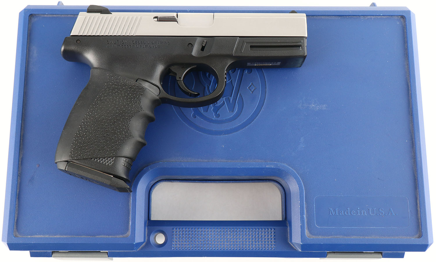 BOXED, Smith & Wesson, Model SW40VE, CAL: 40 S&W, MFG: Modern, SN: PBV5247, Semi Auto Pistol, 3 7/8'' barrel. The checkered polymer grip frame is excellent. The grip has a Hogue stippled rubber grip sleeve. The stainless steel finish on the slide is very good. There are light scrapes, scratches & handling marks. Bore is excellent. Factory contrast sights. Comes in factory hard case, with related paperwork, extra mag & test fire cartridge. FFL Req. - Value: 150 to 300