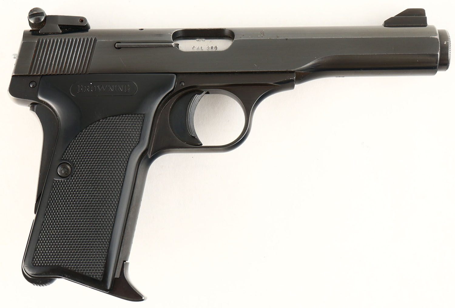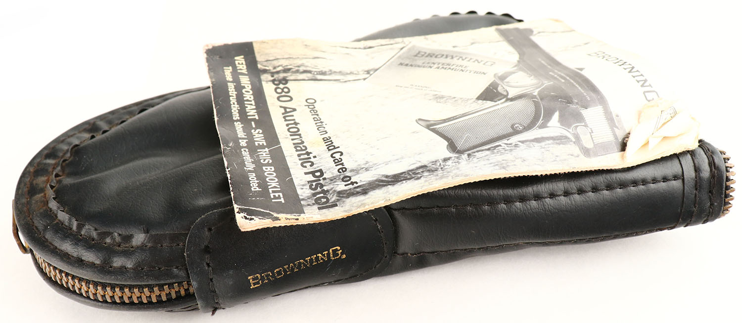 FN Browning, Model 10/71, CAL: .380, MFG: 1972, SN: 72N22253, Semi Auto Pistol, 4 1/2'' barrel. The original Browning checkered plastic grips are excellent. There are handling marks, scrapes & a couple dings. The original metal blue finish rates 97%, with light wear to sharp edges & a couple spots of light speckling. Bore is excellent. Adjustable rear sight & serrated blade front sight. Comes in black leather, red velvet lined Browning soft case, with owners manual. FFL Req. - Value: 400 to 650