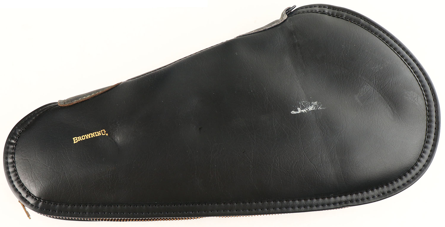 SOFT CASED, Browning, Challenger II, CAL: 22LR, MFG: 1977, SN: 665RR09780, Semi Auto Pistol, 6 3/4'' barrel. The Browning logo medallion wood grips are excellent. The gloss finish is excellent. The original metal blue finish rates 99%+ overall. The frame, slide & sight rib have toned plum. Gold tone trigger. Adjustable rear sight & ramp elevated blade front sight. Comes in black leather, sherpa lined Browning soft case. FFL Req. - Value: 400 to 600