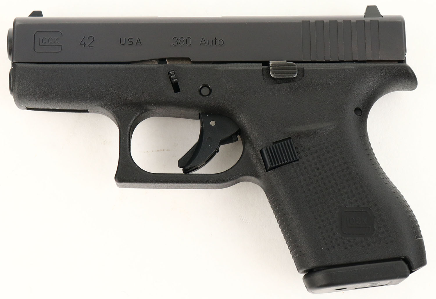 CASED, Glock, Model 42 Gen 4, CAL: .380 Auto, MFG: Modern, SN: ABXS238, Semi Auto Pistol, 3 1/8'' barrel. The less aggressive RTF-4 frame is excellent. The matte black finish on the slide rates 99%+. Bore is excellent. Factory contrast sights. Comes in factory hard case, with owners manual, extra mag & cleaning rod/brush. FFL Req. - Value: 300 to 450