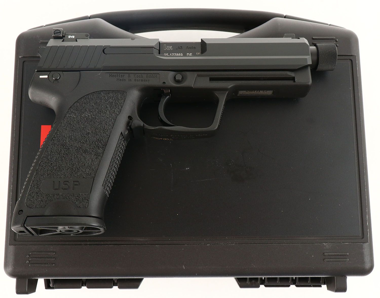 CASED, HK, USP Tactical, CAL: 45 Auto, MFG: Modern, SN: 25-177869, Semi Auto Pistol, 5'' barrel. The checkered & textured polymer grip frame is excellent. The matte black finish on the slide is mint. Bore is mint. Factory high-profile night sights. Threaded barrel. Comes in factory hard case, with related paperwork, O-rings, tools, & extra magazine. Essentially a NIB pistol. FFL Req. - Value: 1000 to 1500