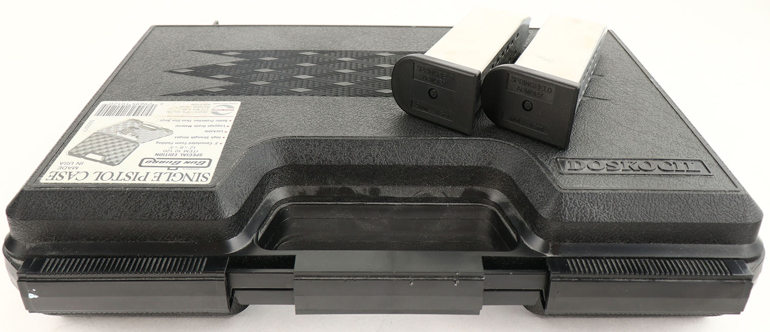 Springfield Armory, XD-9, CAL: 9mm, MFG: Modern, SN: US129596, Semi Auto Pistol, 4'' barrel. The synthetic textured & checkered grip frame is excellent. The matte black Melonite finish is excellent. Bore is excellent. Factory contrast sights. Comes in non-factory hard case, with two extra mags. FFL Req. - Value: 350 to 450