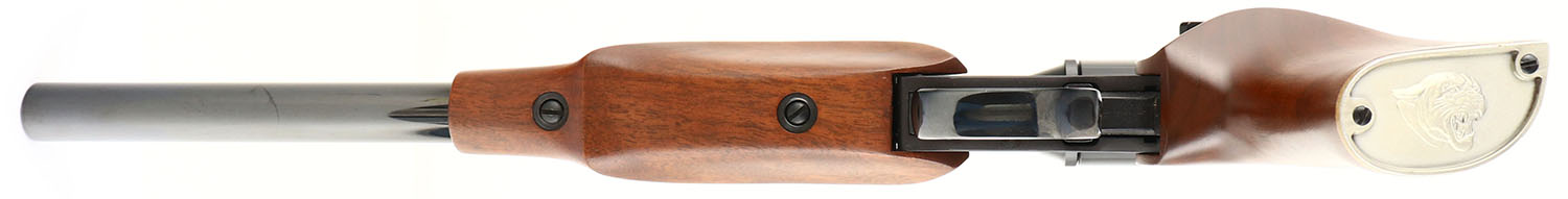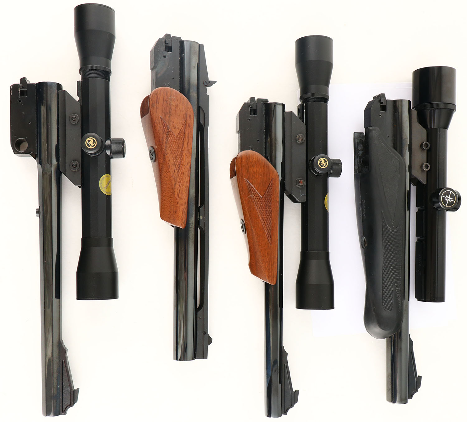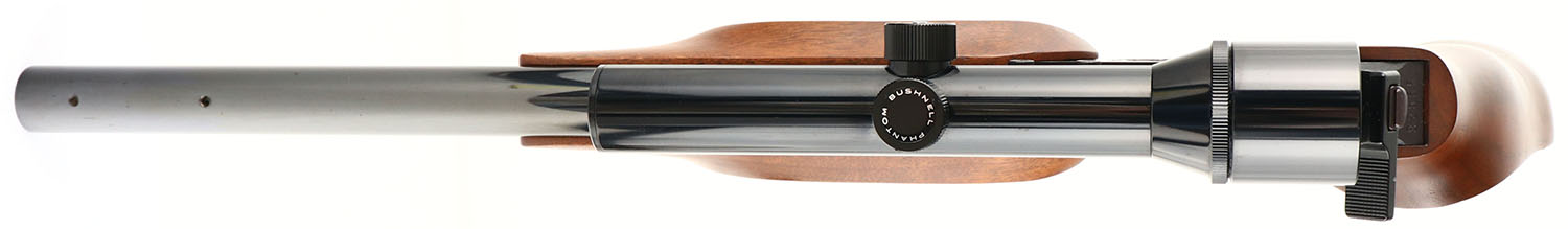 PISTOL & 4 BARREL SET: Thompson, Contender ''Super'', CAL: 30-30 WIN, MFG: 1978, SN: 82555, Break Action Single Shot Pistol, 14'' bull barrel. The TC right hand ergonomic wood stocks are excellent. The metal blue finish rates 99% overall. The frame is beginning to tone plum. Bore is excellent. The barrel carries a Bushnell Magnum Phantom 1.3x scope. No front sight, with (2) open screw holes. Additionally, this pistol comes with (4) variations of Contender barrels, they are as follows: (1) .357 MAG TCA 10'' octagon barrel, with checkered wood forend & LOBO 3x scope, ramped blade front sight. Bore is excellent, some hardened gunpowder residue remaining after cleaning. Grade: Excellent. (2) .44 MAG TCA 10'' round barrel, with ventilated rib, checkered wood forend, flip-up rear sight & blade front sight, bore is excellent. Grade: Excellent (3) .41 MAG TCA 10'' round barrel, with checkered hard rubber forend, Bushnell Magnum Phantom 1.3x scope, ramp elevated blade front sight, bore is excellent. Grade: Excellent (4) 22LR TCA 10'' octagon barrel, no forend, LOBO 3x scope, ramp elevated blade front sight, bore is excellent. Grade: Excellent. The extra barrels come in a TC black leather carrying case, with sheep skin interior. A nice set, with many variations. FFL Req. - Value: 800 to 1400