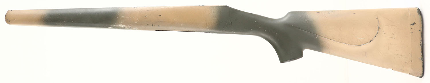 Remington 700 used take-off wooden stock. Capped pistol grip. Rattle can two-tone camo style painted. Some scratches & abrasions, Remington solid recoil pad. Missing sling studs. Overall condition is very good. - Value: 10 to 50