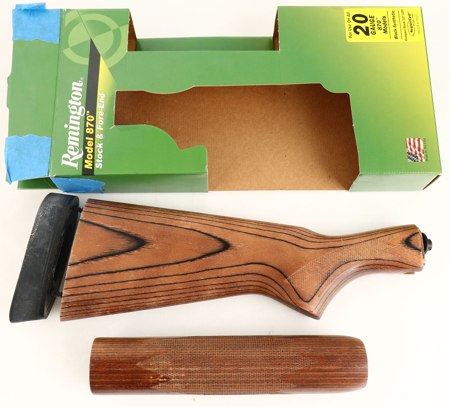BOXED, Remington Model 870 20GA stocks. Two piece, checkered, flat pistol grip, minor storage marks. Grade: Very Good++ - Value: 50 to 200