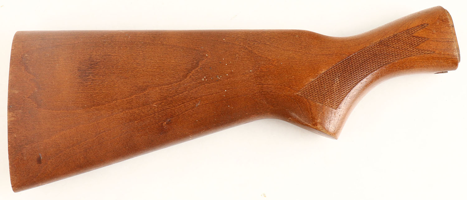 Remington model 870, take-off stock, Factory checkered & flat pistol grip. Factory finish with thin added coat, Very few blemishes. Stamped ''870 EXP'' on receiver end. Cut for recoil pad. Grade very good. - Value: 10 to 30